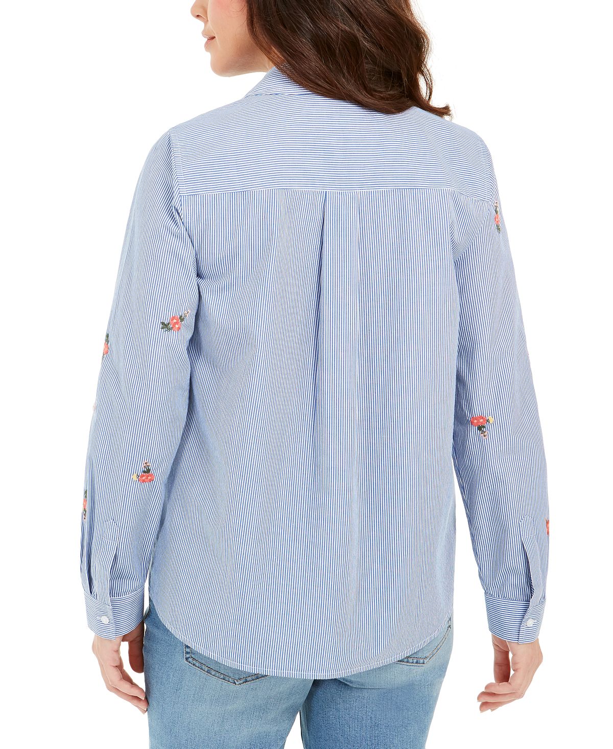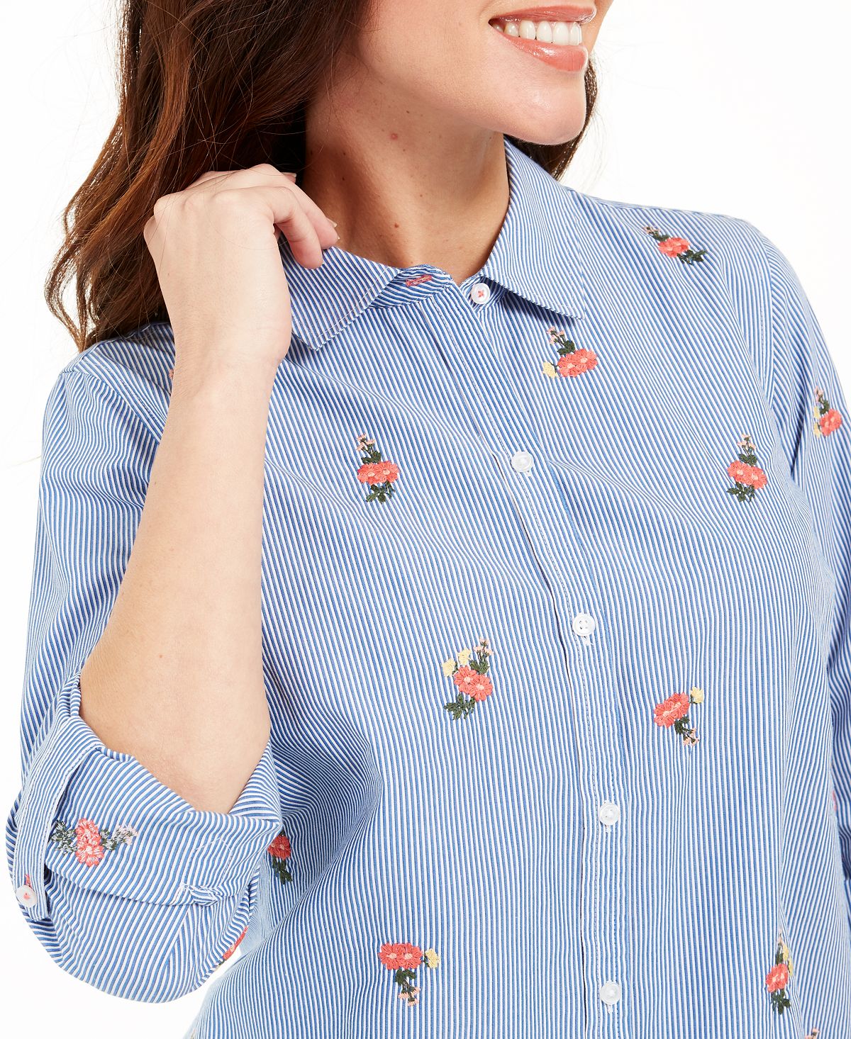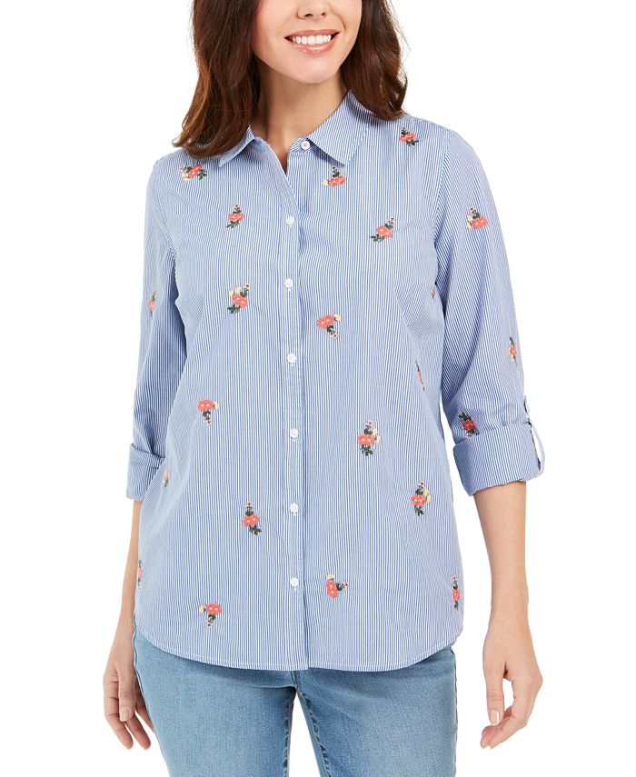 Add a touch of sunshine to your wardrobe with Charter Club's printed woven shirt. The stripes add dimension while the floral embellishments add a breath of fresh air.| Due to generous sizing| we suggest sizing down for the perfect fit| Point collar; button-front closures| Floral embellishments at front and on sleeves| Roll-tab sleeves