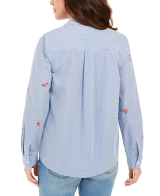 Charter Club Women's Cotton Embroidered Striped Shirt Blue - White Size Petite Medium