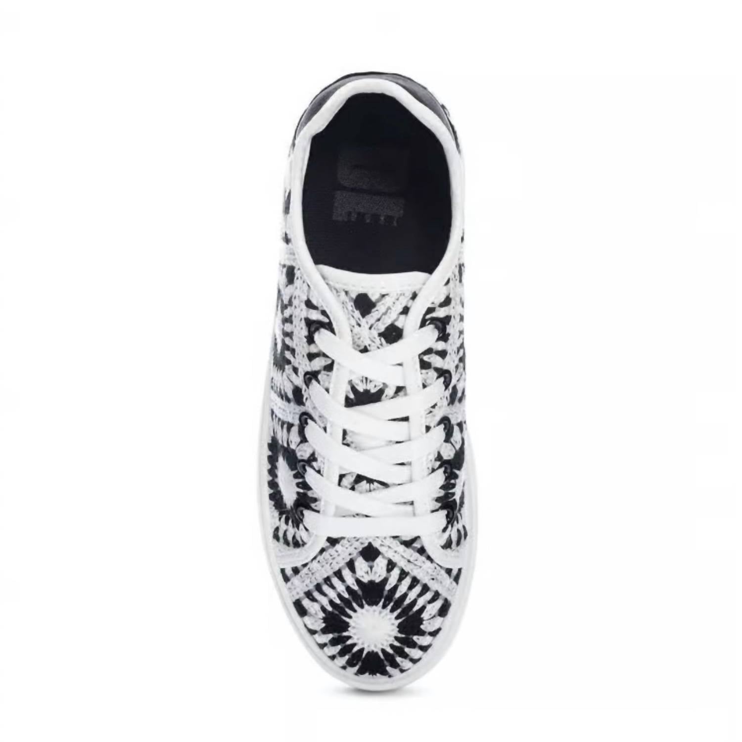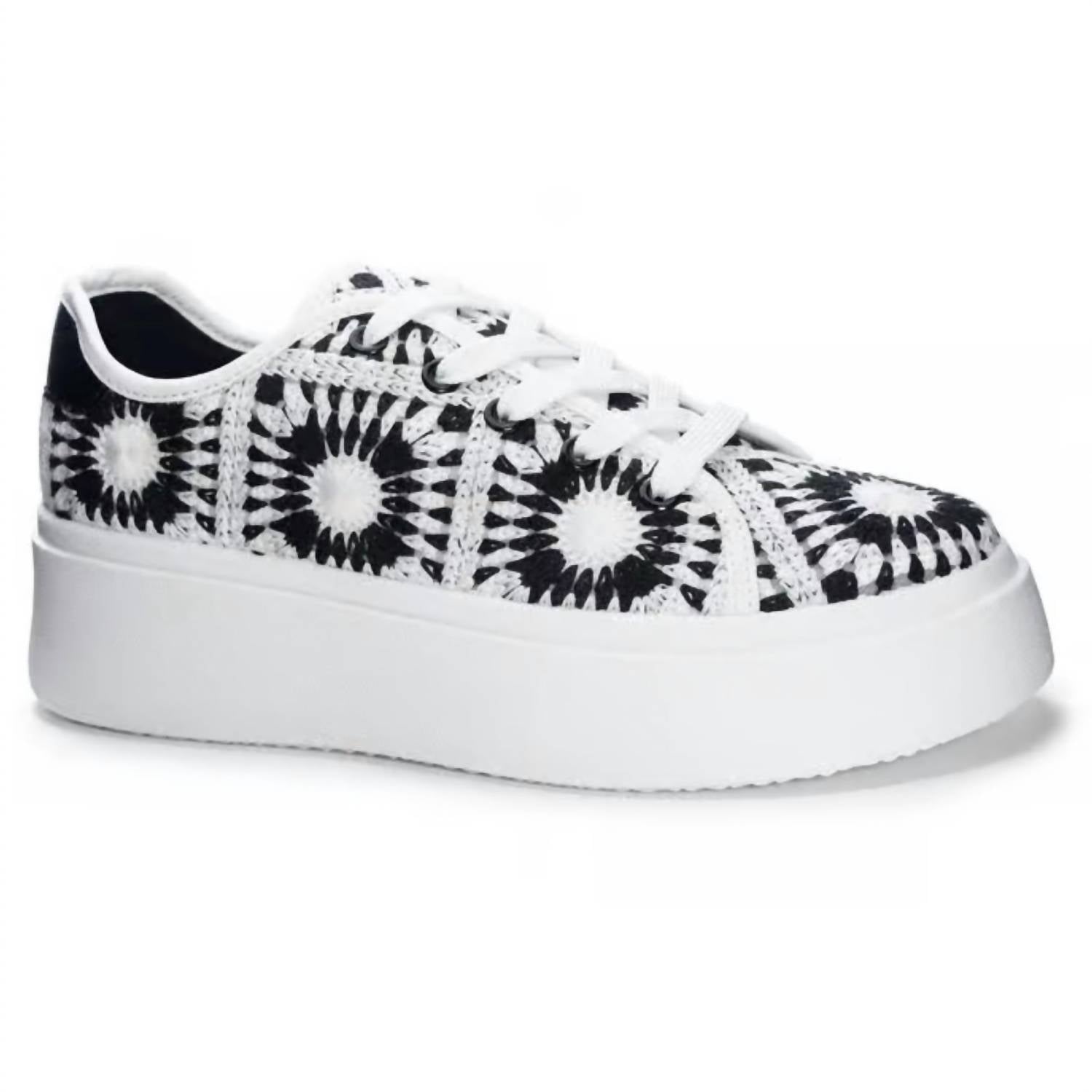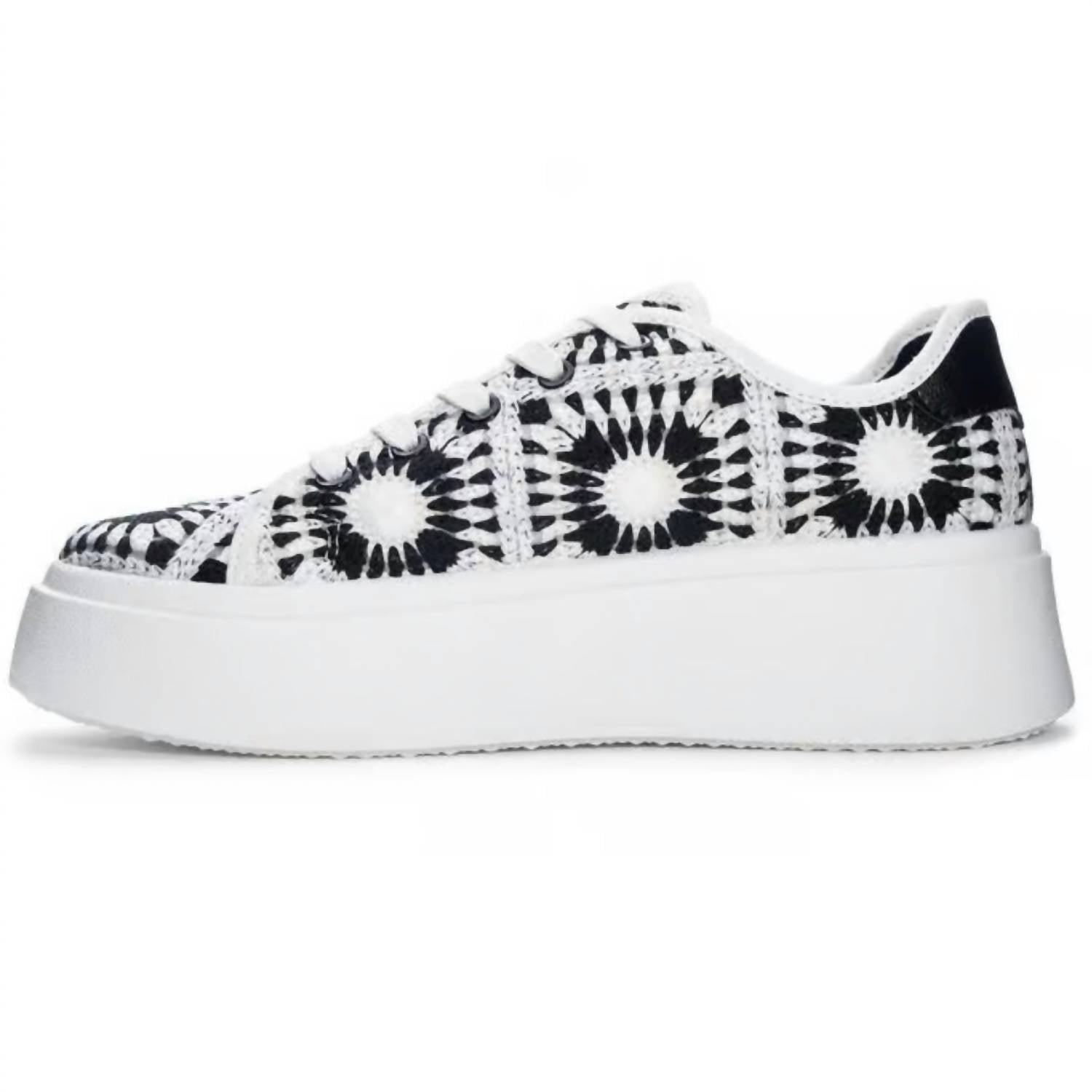 Cute, functional, and comfortable. These sneakers check all the boxes.With a rounded toe, platform sole, and lace-up design, this Y2K-inspired macramé sneaker is the most fashionable way to see the world in black & white. Fabric and manmade materials. 2" heel, 1.25" platform