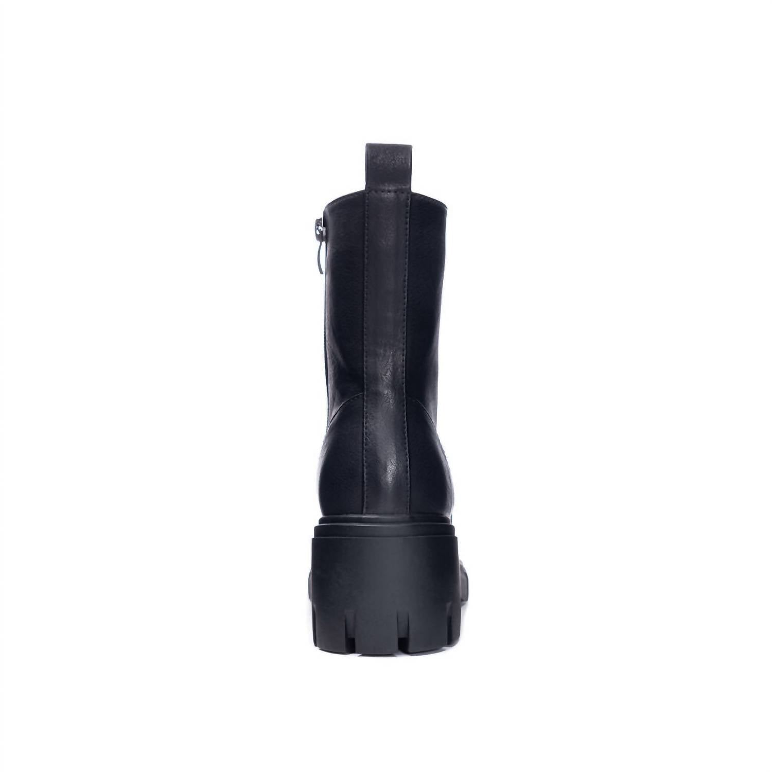 Classic black combat boot. Moderate heel. Rubber sole. Fully laced with zipper.