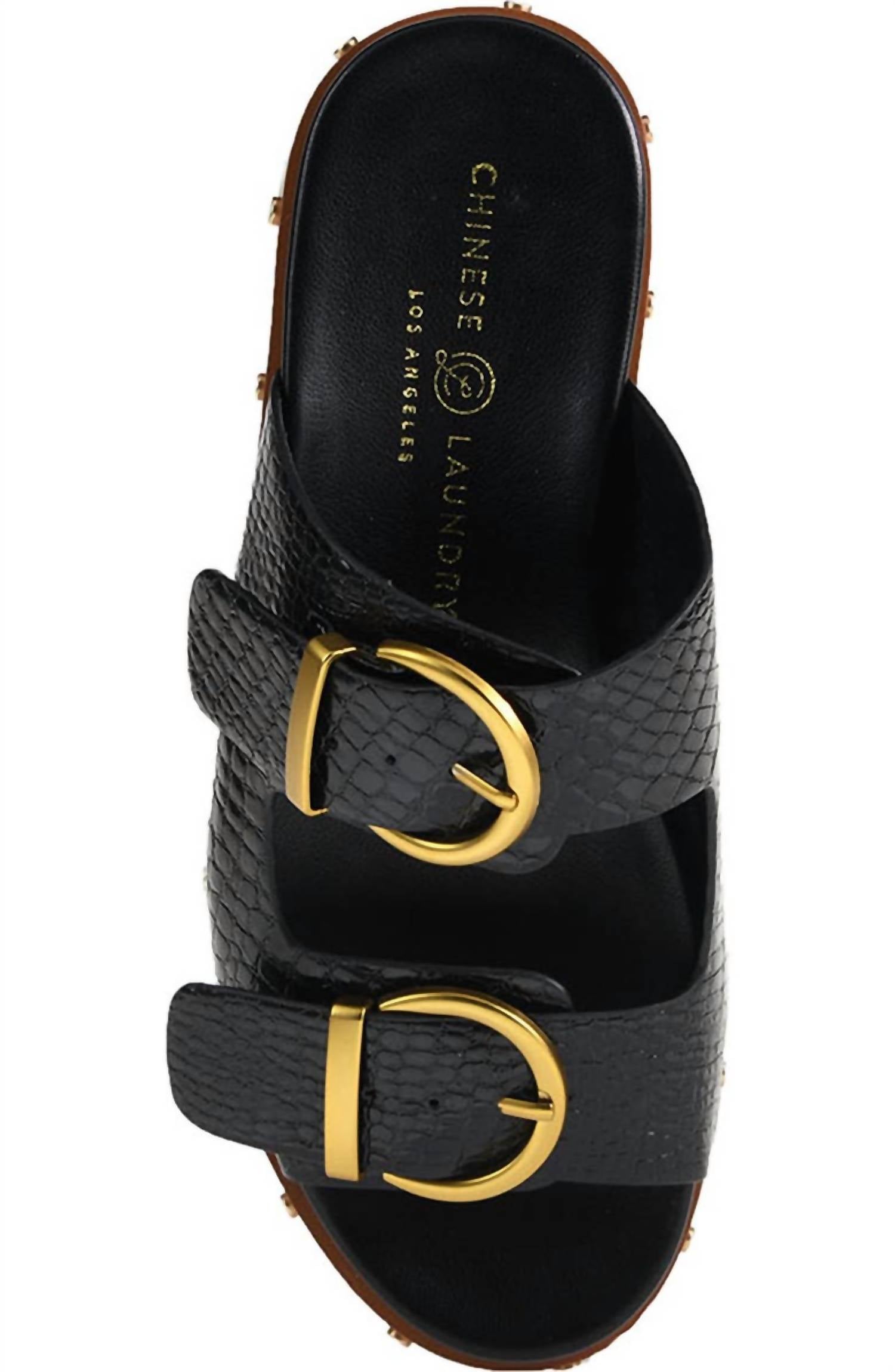 Flowy dresses, cropped pants, and even jumpsuits... this sandal works with them all! Step into summer with the Surfs Up Crocodile Sandal by Chinese Laundry, a stylish choice in sleek black. These wedge sandals feature eye-catching vamp straps with oversized buckles and an ultra-comfortable footbed. Engineered from faux leather, they boast a slip-on closure with a platform heel measuring 2.5 inches and a platform height of 1.5 inches. Perfect for any occasion, from housewarmings to 4th of July celebrations.