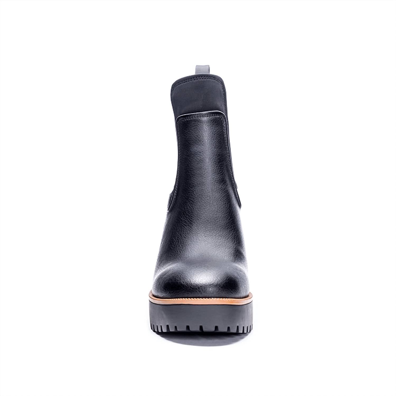 Upgrade your shoe game with these classic heeled boots, designed to merge sophistication and style. Comfortable enough for long days or a night out on the town. Step into style with the Women's Good Day Bootie by CHINESE LAUNDRY, perfect for any fall ensemble. Crafted from smooth faux leather, these ankle-high heeled boots boast a rounded toe and a contrasting ribbed olive green gusset for a chic two-tone effect. A chunky 3.5" rubber block heel and platform lug sole add an edgy touch, while the cushioned insole ensures comfort. Slip-on design with a pull tab at the back for easy wear, and a rubber sole with nonskid markings for added stability.