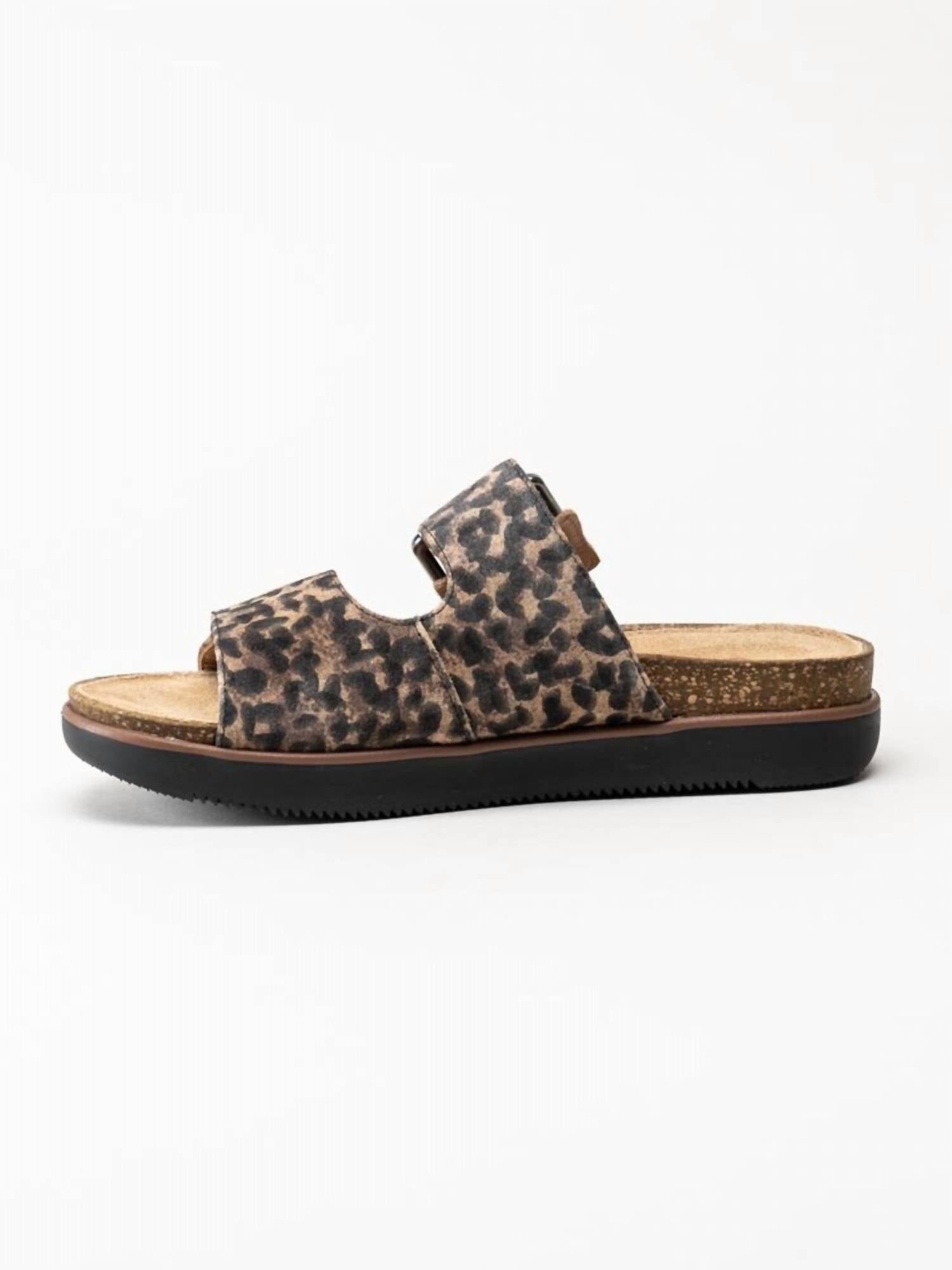 Classicly cute and all-day-wearable. We love this sandal. Step into sophisticated style with the Women's Elayne Ease Sandal by Clarks, adorned in a chic leopard print. Crafted from luxurious suede with a leather lining, these slip-on sandals offer both comfort and elegance. The insole features a suede finish while the outsole is made from durable synthetic material. Perfect for spring dinner parties, this minimalist sandal with an open toe and flat heel is an essential addition to your wardrobe.