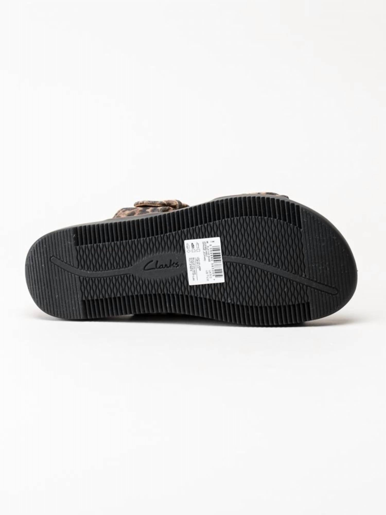 Step into sophisticated style with the Women's Elayne Ease Sandal by Clarks, adorned in a chic leopard print. Crafted from luxurious suede with a leather lining, these slip-on sandals offer both comfort and elegance. The insole features a suede finish while the outsole is made from durable synthetic material. Perfect for spring dinner parties, this minimalist sandal with an open toe and flat heel is an essential addition to your wardrobe.