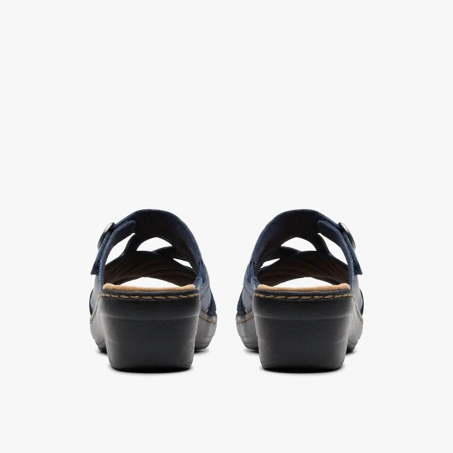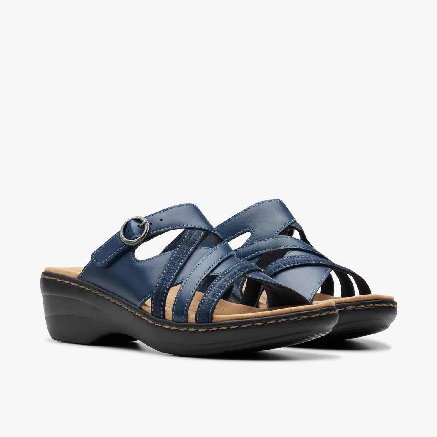 Flowy dresses, cropped pants, and even jumpsuits... this sandal works with them all! Presenting the Women's Merliah Holly Sandal by Clarks, a sophisticated choice for evening events. Crafted from premium leather and designed with a strappy vamp, this sandal features an adjustable ankle strap and buckle closure for the perfect fit. A mesh lining, rubber insole offers added comfort, and the EVA outsole ensures durability. With a 1.1-inch heel, these navy sandals flawlessly combine style and functionality.