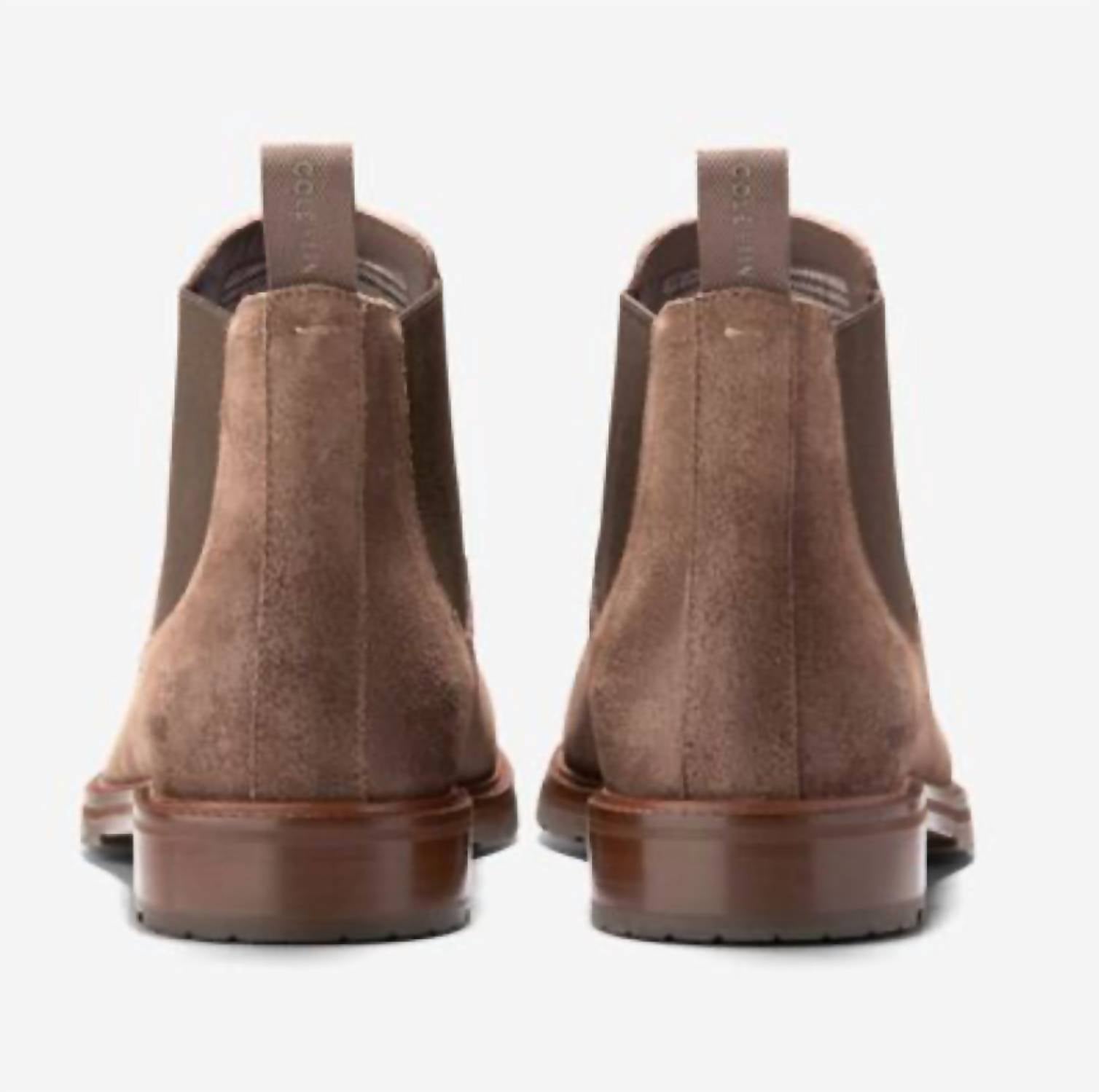 Step into style with the Berkshire Suede Chelsea Boot by Cole Haan, designed to combine elegance with functionality. Featuring a water-resistant suede upper in Lava Wash, this boot is perfect for the harsher seasons, supported by a rugged lug sole and flat heel for comfort. With elastic gores and a back pull tab, these boots offer an easy slip-on experience. The suiting-inspired fabric lining ensures a polished look for men at any black-tie event.