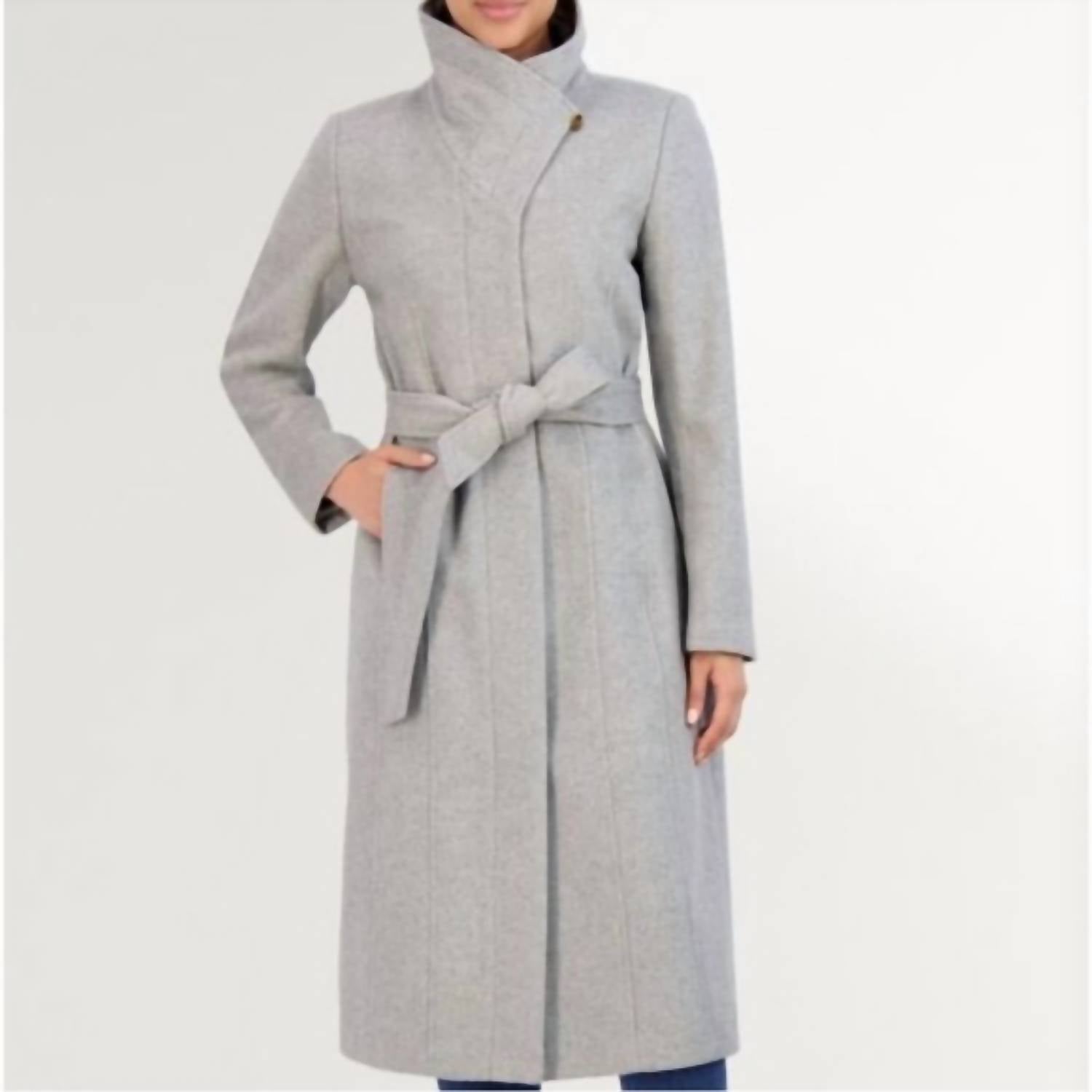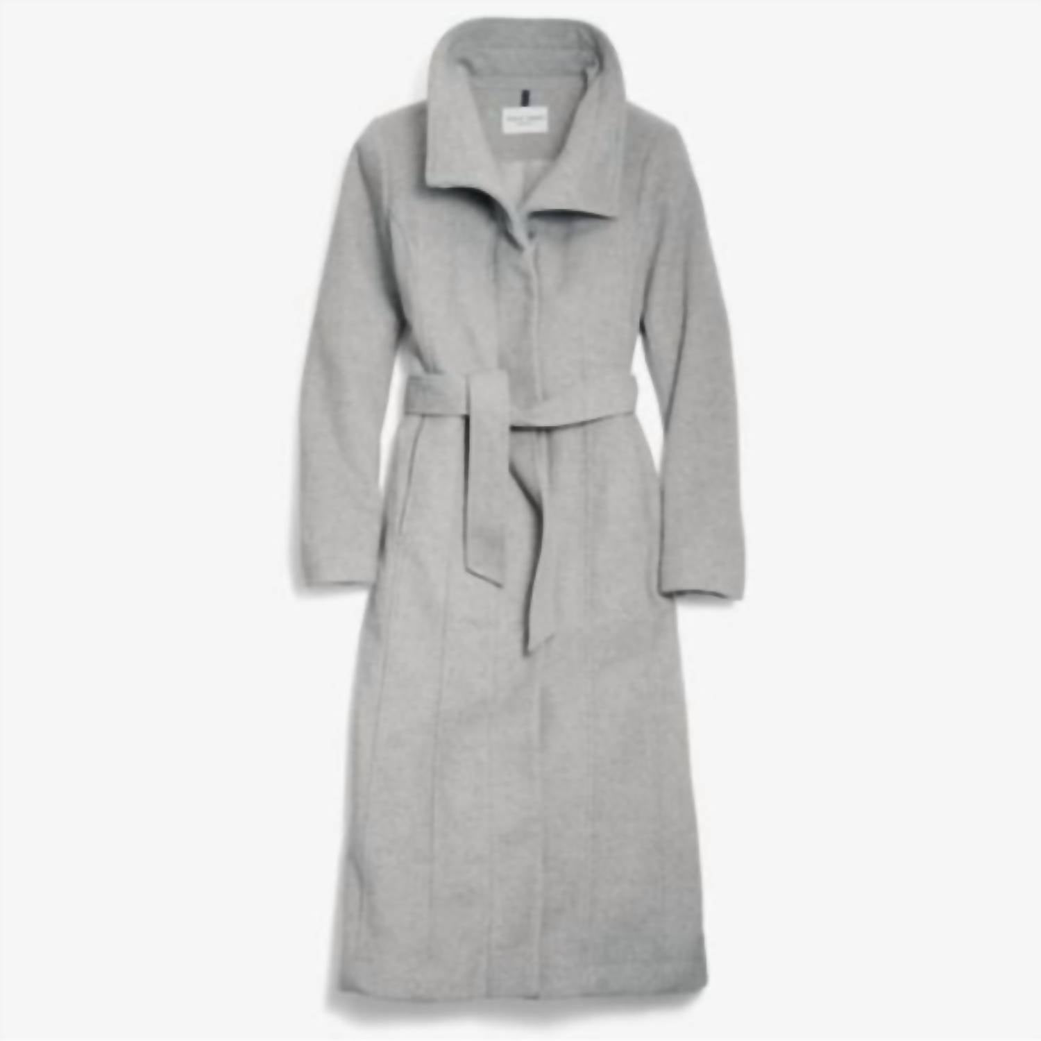 Elevate your winter wardrobe with the Slick Belted Long Coat by Cole Haan in a chic Stone Gray. This calf-grazing coat features long sleeves, a high funnel neck, and a stylish fabric belt tie for a flattering silhouette. Crafted from a 52% wool, 45% polyester, and 3% other fibers blend, the coat is fully lined and designed with a hidden placket zip and snap closure to keep you warm in any climate. Care for this timeless piece with dry cleaning, ensuring that you carry its minimalist elegance season after season. Size 4 measures 18” across the chest, 44” long, with 24” sleeves.