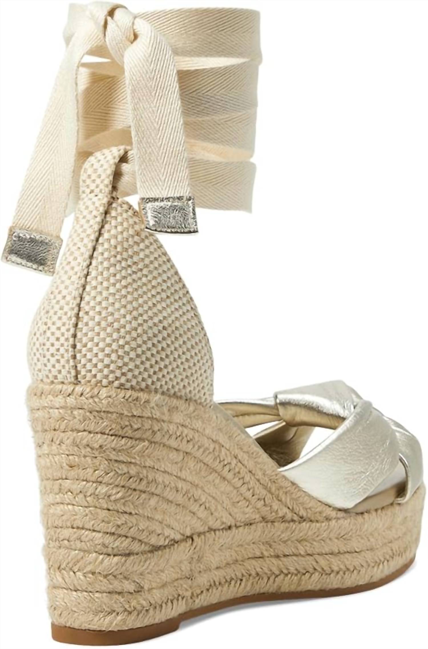 Flowy dresses, cropped pants, and even jumpsuits... this sandal works with them all! Elevate your summer style with the Women's Cloudfeel Hampton Wedge Heeled Sandal by COLE HAAN in soft gold leather and natural canvas. These sandals feature a jute wrapped espadrille design and a comfortable 4-inch wedge heel, perfect for adding charm to any outfit from jeans to dresses. The leather and canvas uppers are complemented by a playful peep toe and ribbon-tied ankle straps for a personalized fit. Ideal for minimalist trends and vacation occasions, these sandals promise both style and comfort. Heel Height: High (3 1/4" & Up).