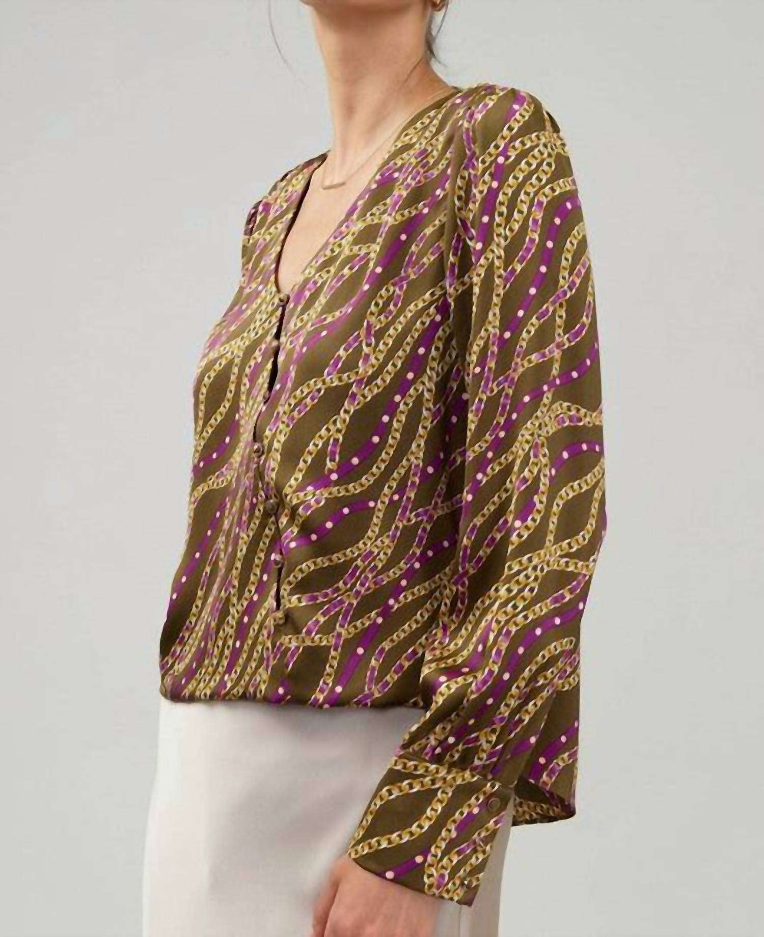 A long sleeve top you can wear with denim, skirts, well... just about anything! Elevate your spring wardrobe with the Augustus V-neck Top by Current Air, featuring long sleeves and a flattering surplus design. Crafted from 100% polyester, this chic blouse captivates with its beautiful olive and wine abstract print. Enjoy the versatility of its V-neckline and button front, perfect for making a statement at work. Proudly made under fair working conditions in China. Care instructions suggest dry clean only to maintain its vibrant look.