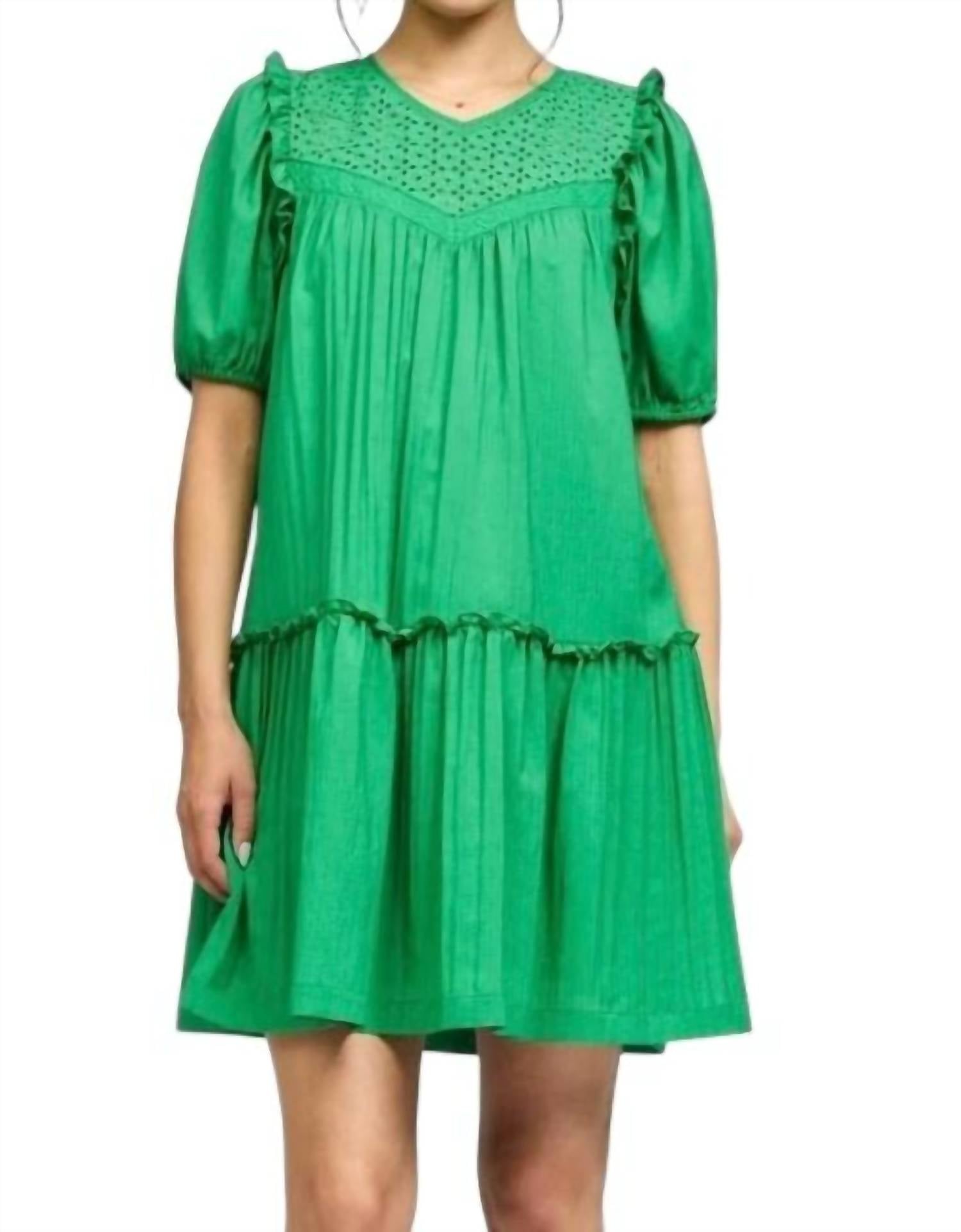 The kind of easy and flattering dress you'll be reaching for all season long. The Eyelet Ruffle Detail Mini Dress by Current Air is a delightful choice for your spring wardrobe. Featuring short sleeves and a flattering V-neck, this cotton blend dress comes in a playful above-knee mini length, perfect for both casual outings and garden parties. Its textured pattern and stylish contrast yoke add a touch of femininity, while the pull-on closure ensures easy wear. Care instructions include hand wash and line dry, making it an effortless addition to your closet for St. Patrick's Day celebrations or festive occasions.
