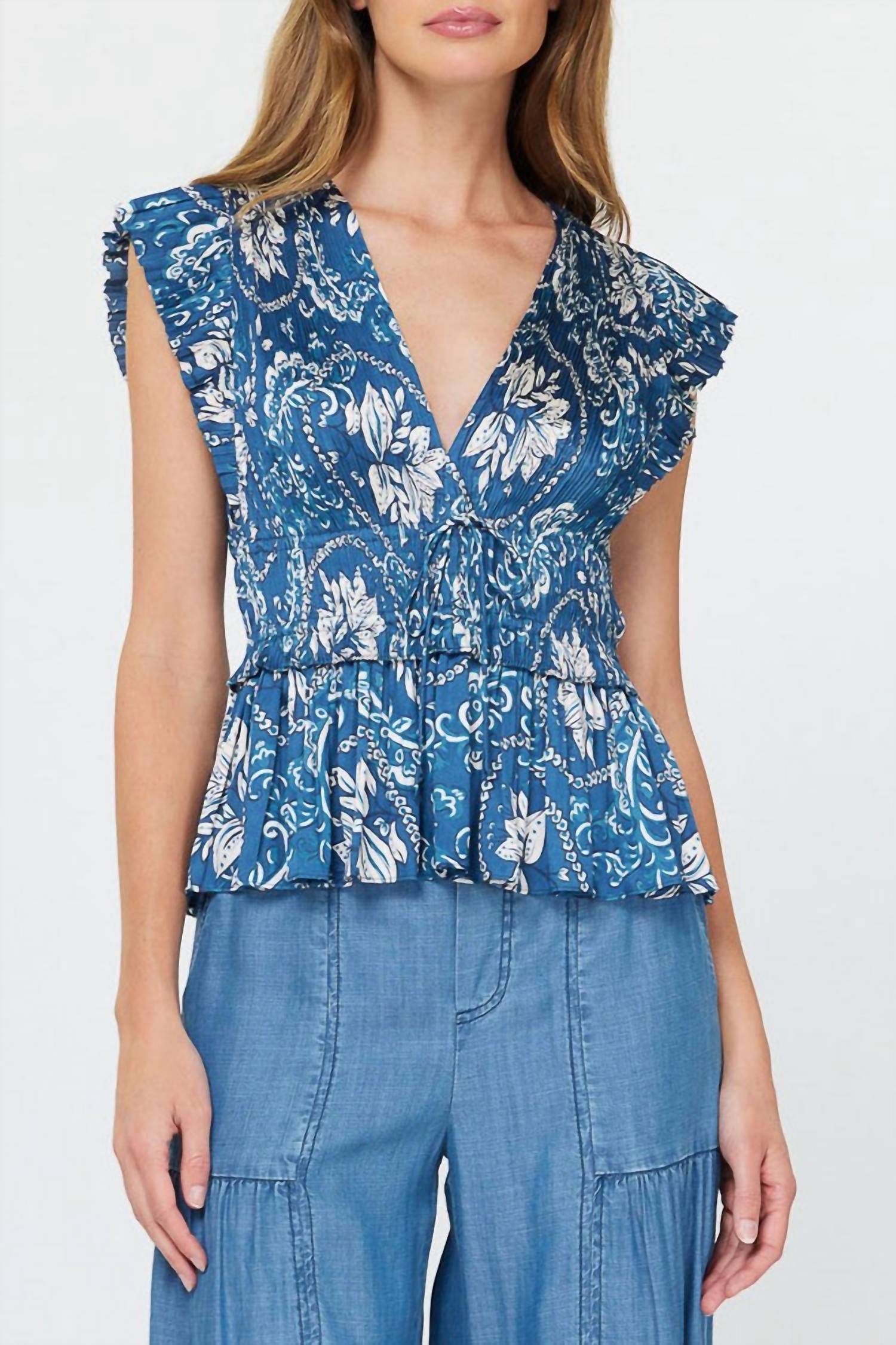 A timeless blouse that will never go out of style. Discover the Floral Pleated Sleeveless Blouse by Current Air, a charming addition to your wardrobe. Expertly crafted from a 50% Recycled Poly and 50% Poly blend, this blouse showcases a delicate floral digital print in blue and white. The design features a flattering V-neckline and a front tie detail, complemented by its pleated texture and gathered waistline for a beautiful silhouette. Closure: Pull on. Care: Machine wash cold, lay flat to dry.