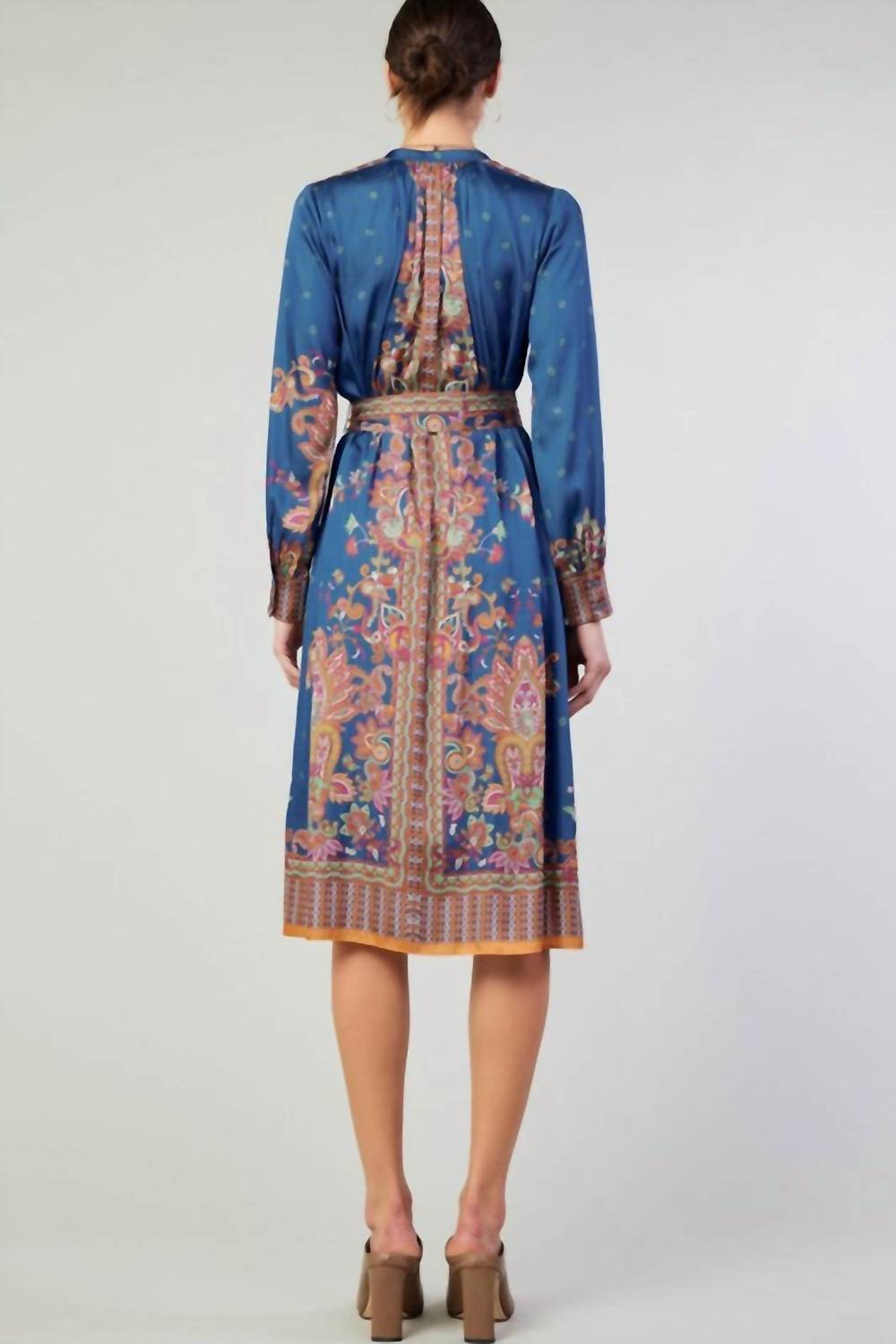 Just add slides or mules and you are good to go. Discover effortless elegance with the Paisley Printed Midi Dress by Current Air, a perfect blend of timeless and contemporary style. Featuring a sophisticated paisley print, this mid-length A-line dress showcases a chic mandarin collar and a flattering V-neckline. The long sleeves are complemented by a self waist belt, enhancing your silhouette with grace.