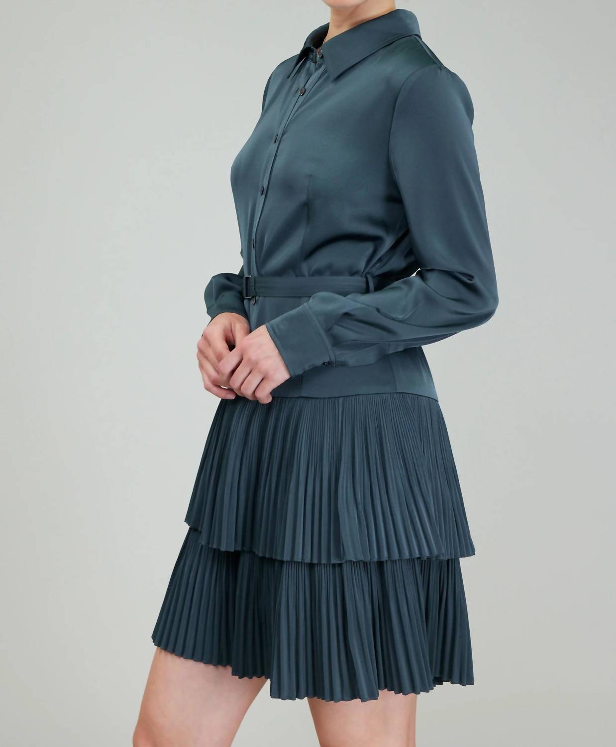 Embrace elegant simplicity with the Pleated Shirt Dress by Current Air, a perfect choice for evening events. This mini dress in forest green boasts long sleeves with button cuffs and a flattering high neckline. The design features an O-ring belt and a sophisticated tiered skirt, beautifully blending fashion-forward style with quiet luxury. Closure is ensured with a button front placket, making it ideal for a summer evening.