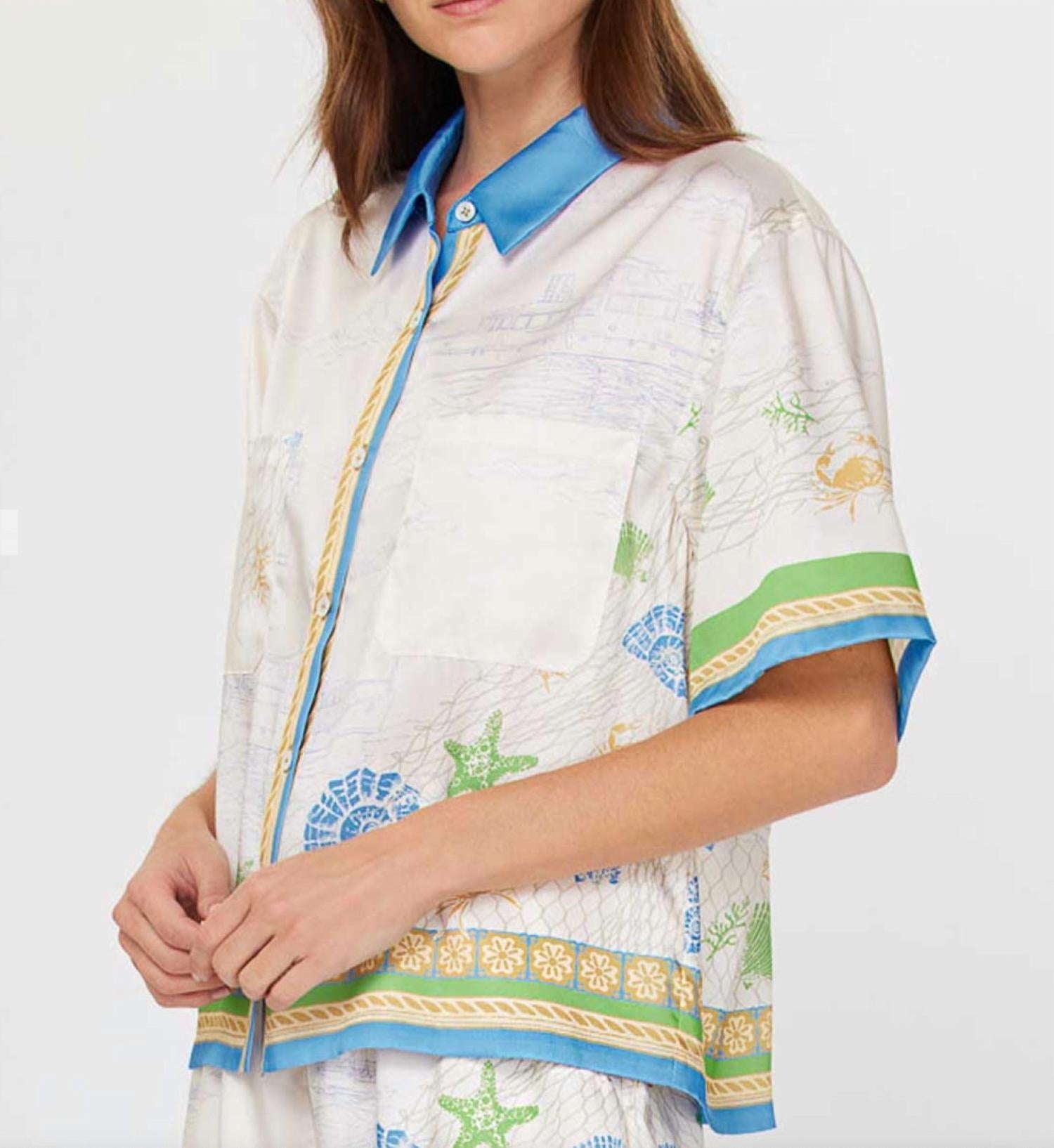 Look no further, you just found your perfect tee! Dive into coastal charm with this playful button-front blouse! Featuring a flattering collar and breezy short sleeves, the Sandi Coastal Print Shirt brings seaside vibes to your wardrobe. Create the perfect summer ensemble by pairing with our matching Sandi Coastal Print shorts for an effortlessly coordinated look that's ready for boardwalk strolls or beachside brunches!