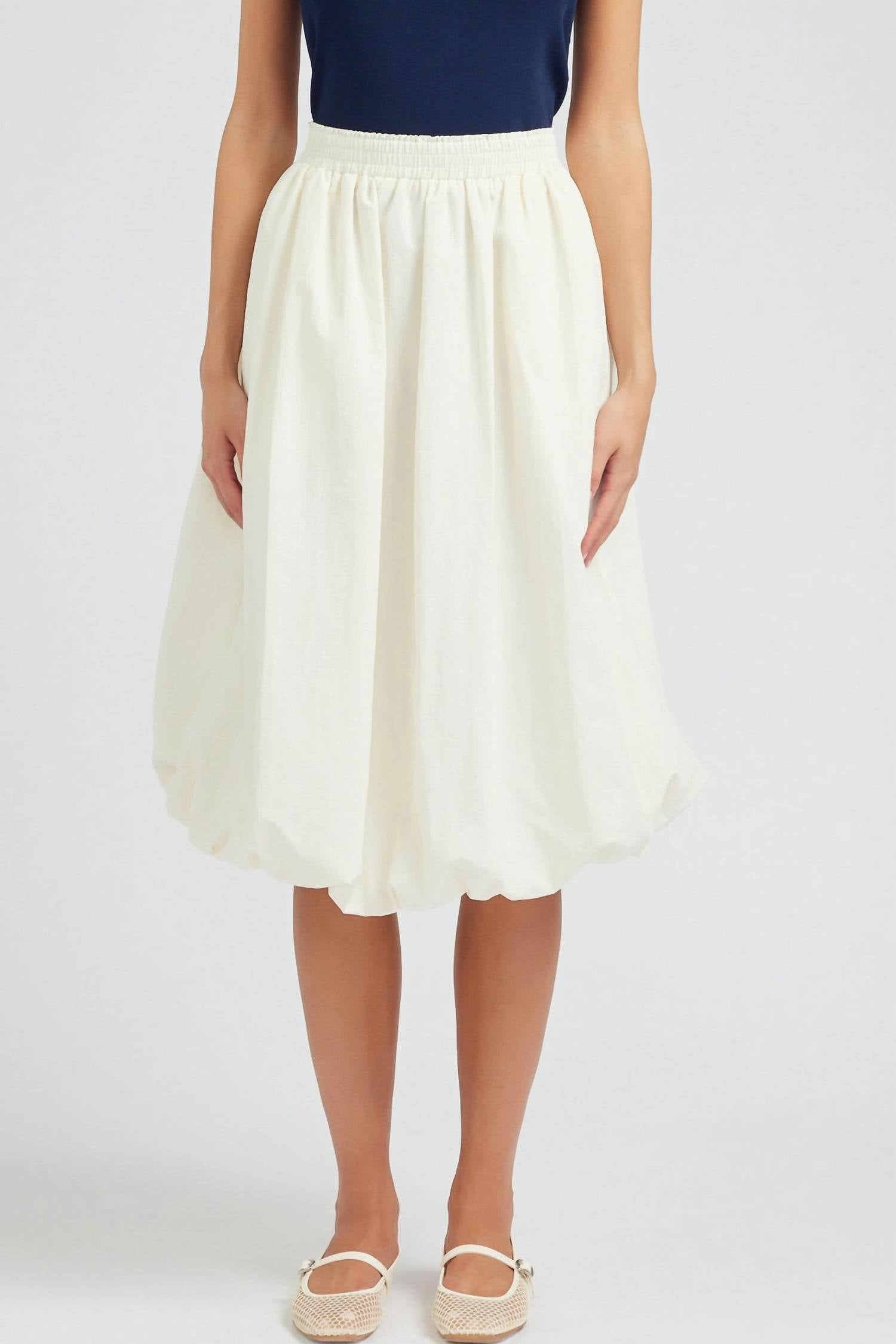 Tuck your favorite tee into this midi length skirt for an effortlessly cool look. Elevate your wardrobe with the Sarai Midi Bubble Skirt by Current Air, a chic cream piece that adds elegance to any ensemble. This skirt features a unique balloon bubble hem and an elastic waist for comfort and style. Made from 100% Nylon and designed for a flattering fit, it offers a sleek pull-on closure. Care: Machine wash and lay flat to dry. Model wears a size small, which is true to size.