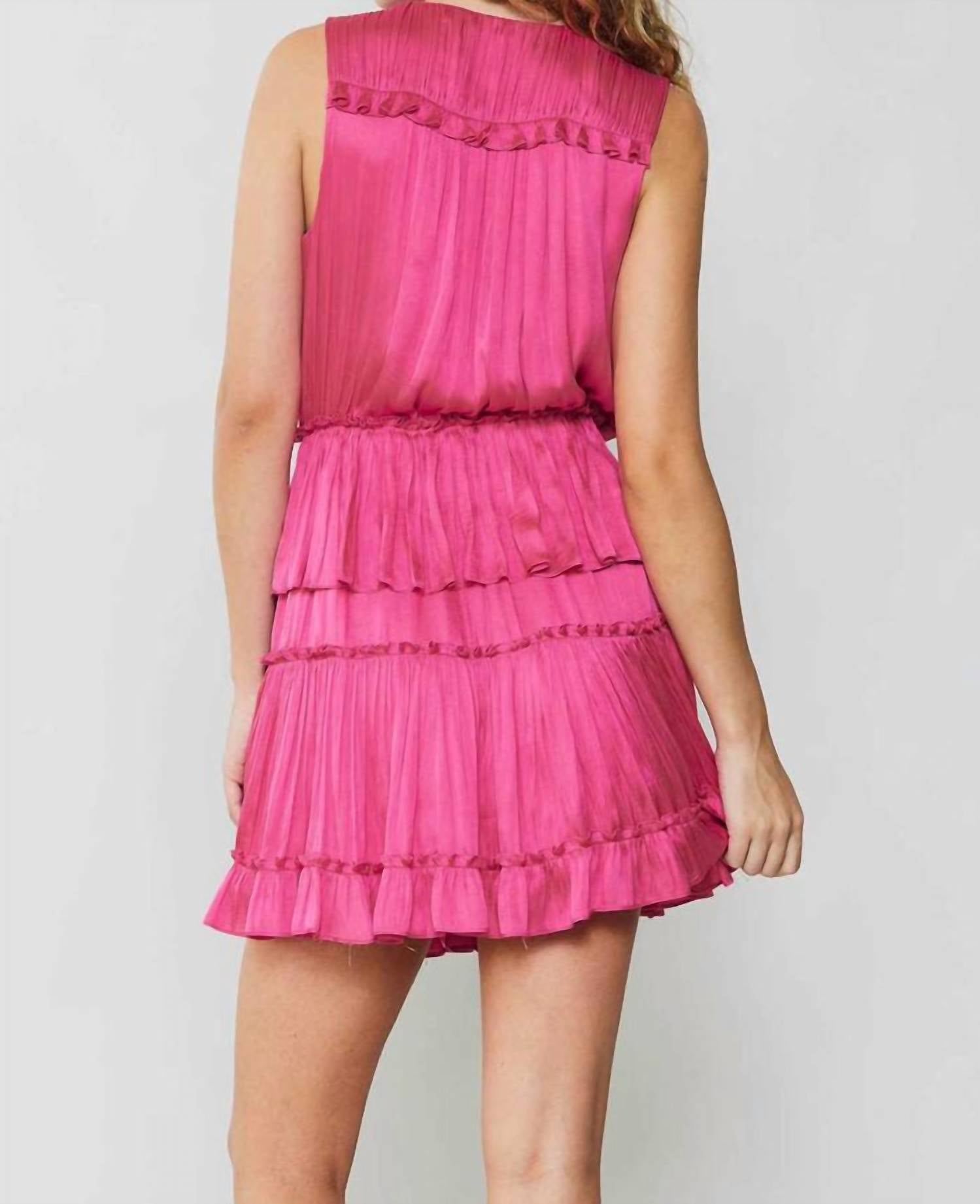 A short and breezy dress for those warmer days. Introducing the V-Neck Ruffled Mini Dress by Current Air, a stunning choice in azalea pink. This sleeveless dress features a surplice-style bodice with a gathered back yoke, lending an elegant touch to its silhouette. Crafted from 100% Polyester with a Rayon lining, it boasts an elasticized waist and a tiered skirt adorned with ruffles for added flair. This imported piece measures 36 inches in length and requires hand washing in cold water.