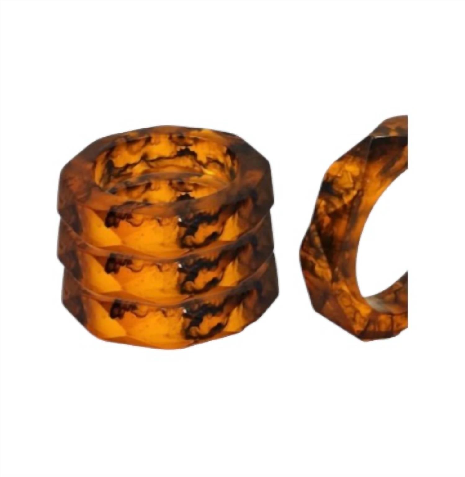 Introducing the Prism Napkin Rings Set Of 4 by Borrowed BLU, a chic addition to your tableware collection. Crafted from lucite, these napkin rings in a striking tortoise color embody a sleek, contemporary, and geometric design. Elevate your dining setup with these translucent accents that effortlessly complement the Prism Flatware Sets. Embrace elegant entertaining with this sophisticated design.