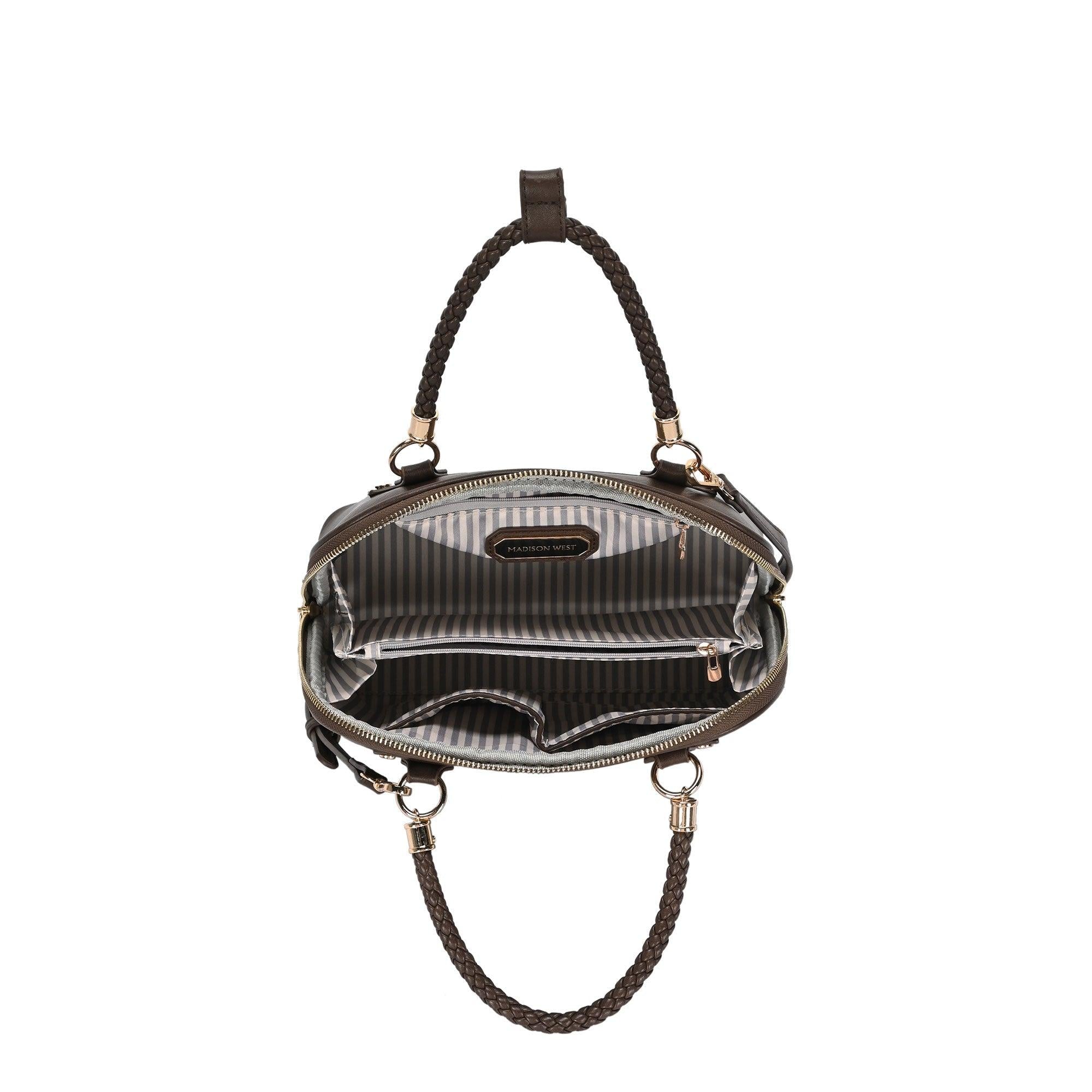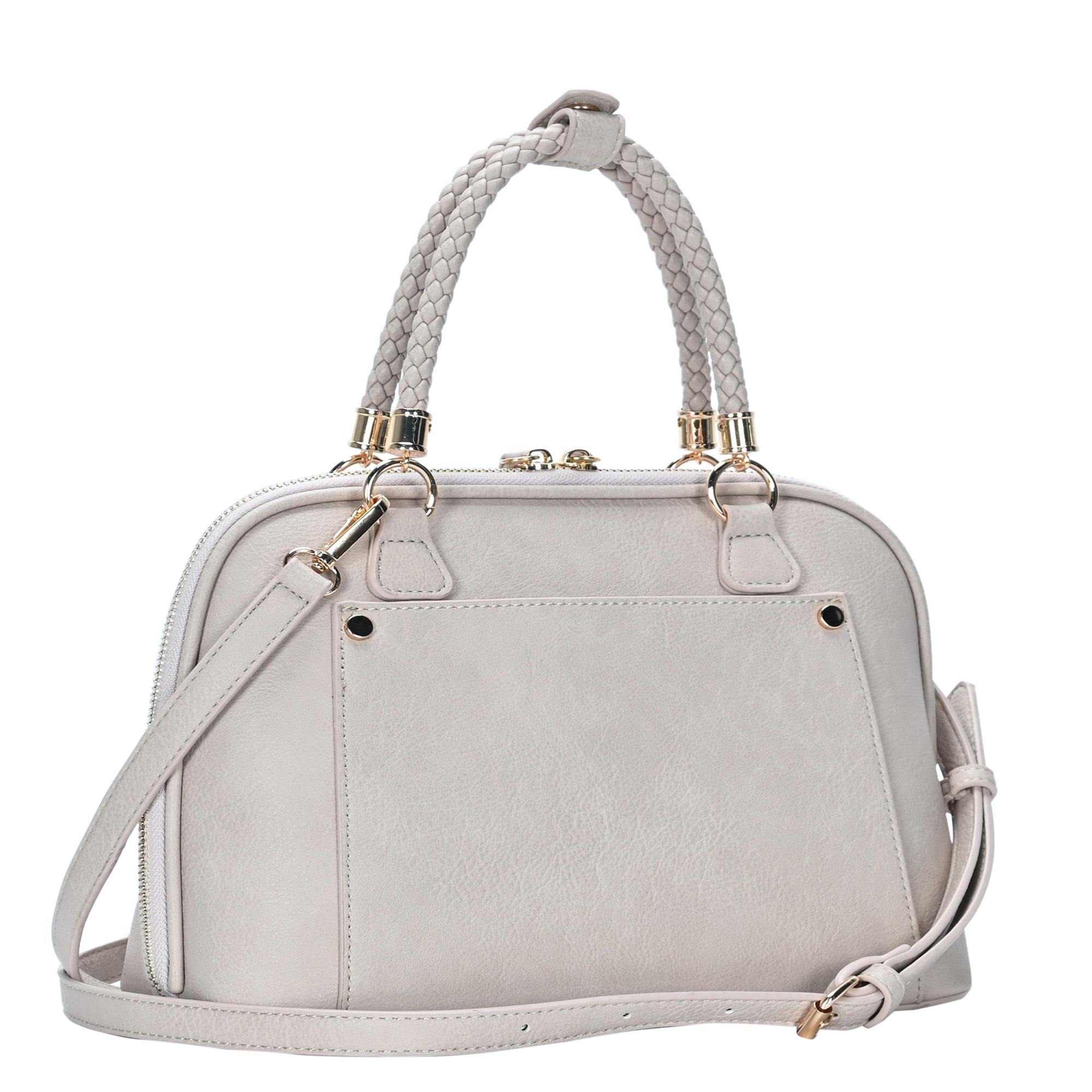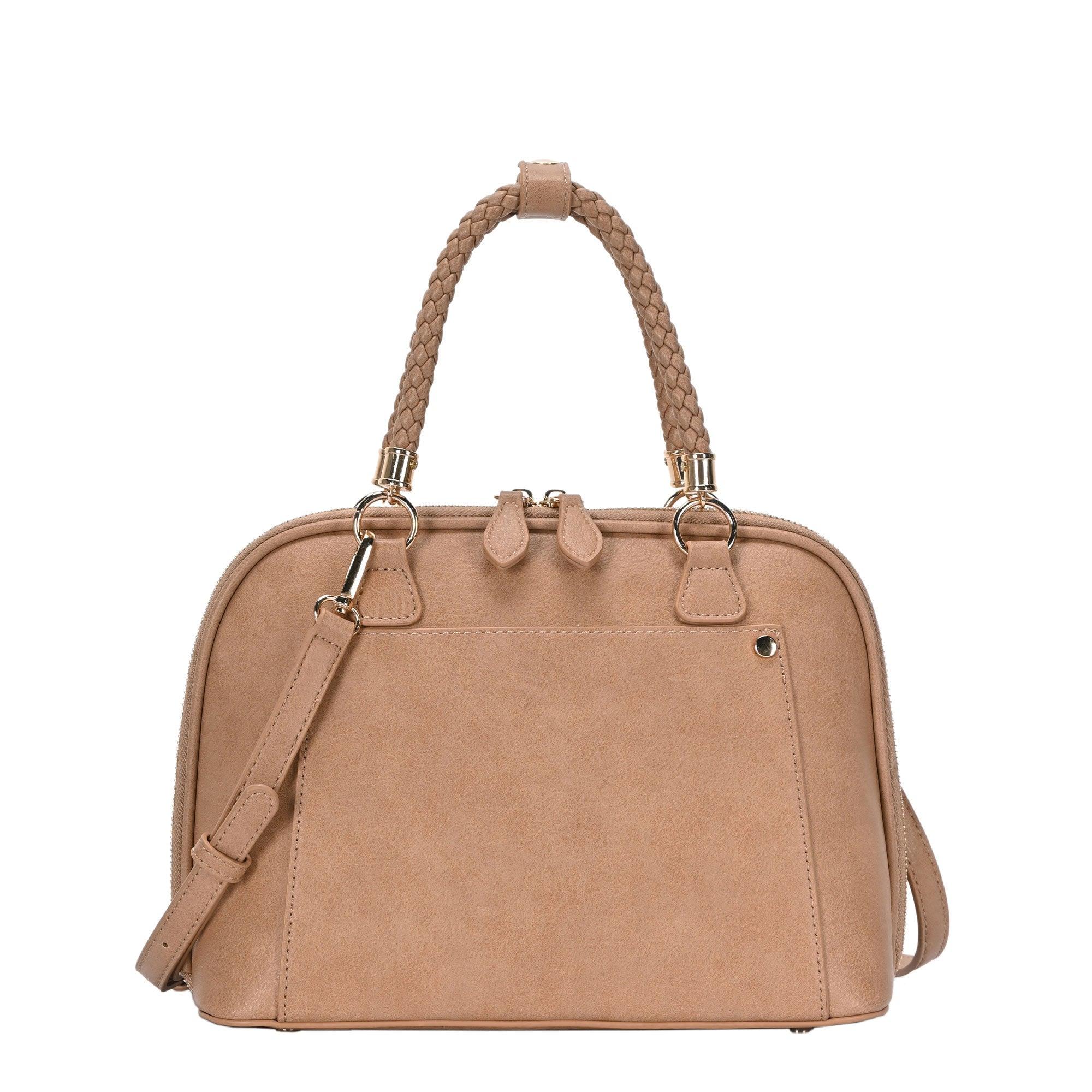 The Camila Satchel is the ultimate combination of form and function. Its wide accordion opening and spacious interior are perfect for storing all your essentials. Made of soft distressed vegan leather with polished gold hardware, it also features unique braided handles and an adjustable crossbody strap. A must-have for any day trip!