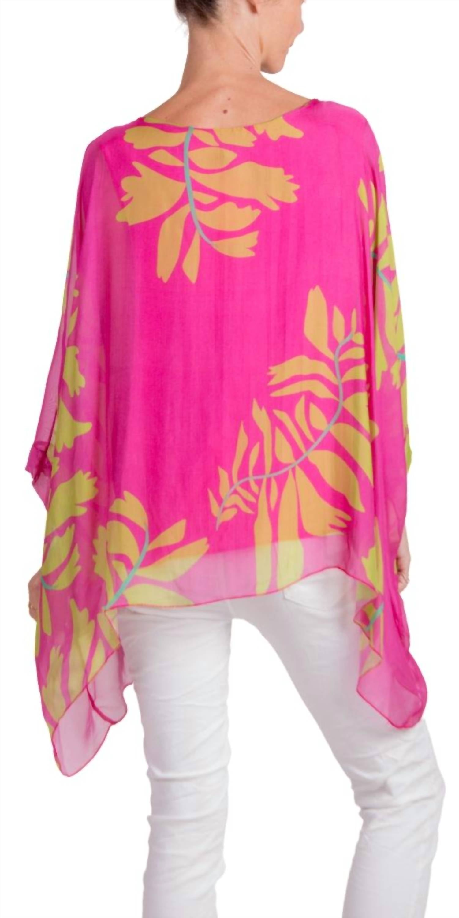 Embrace the versatility of this tunic-style blouse, expertly crafted for seamless layering or perfect to wear on its own. Its detailed design and comfortable fit make it a perfect addition to any closet. Embrace effortless elegance with the Seta Foglia Kaftan by GIGI MODA, crafted for the boho chic aficionado. This women's tunic features three-quarter sleeves and is adorned with a large leaf floral pattern in vibrant hot pink. Made from an exquisite silk blend of 30% Silk and 70% Viscose, complemented by a 95% Viscose and 5% Elastic interior. Originating from Italy, the pull-on closure and wavy bottom ensure a relaxed yet stylish fit, suitable for sizes XS to XL.