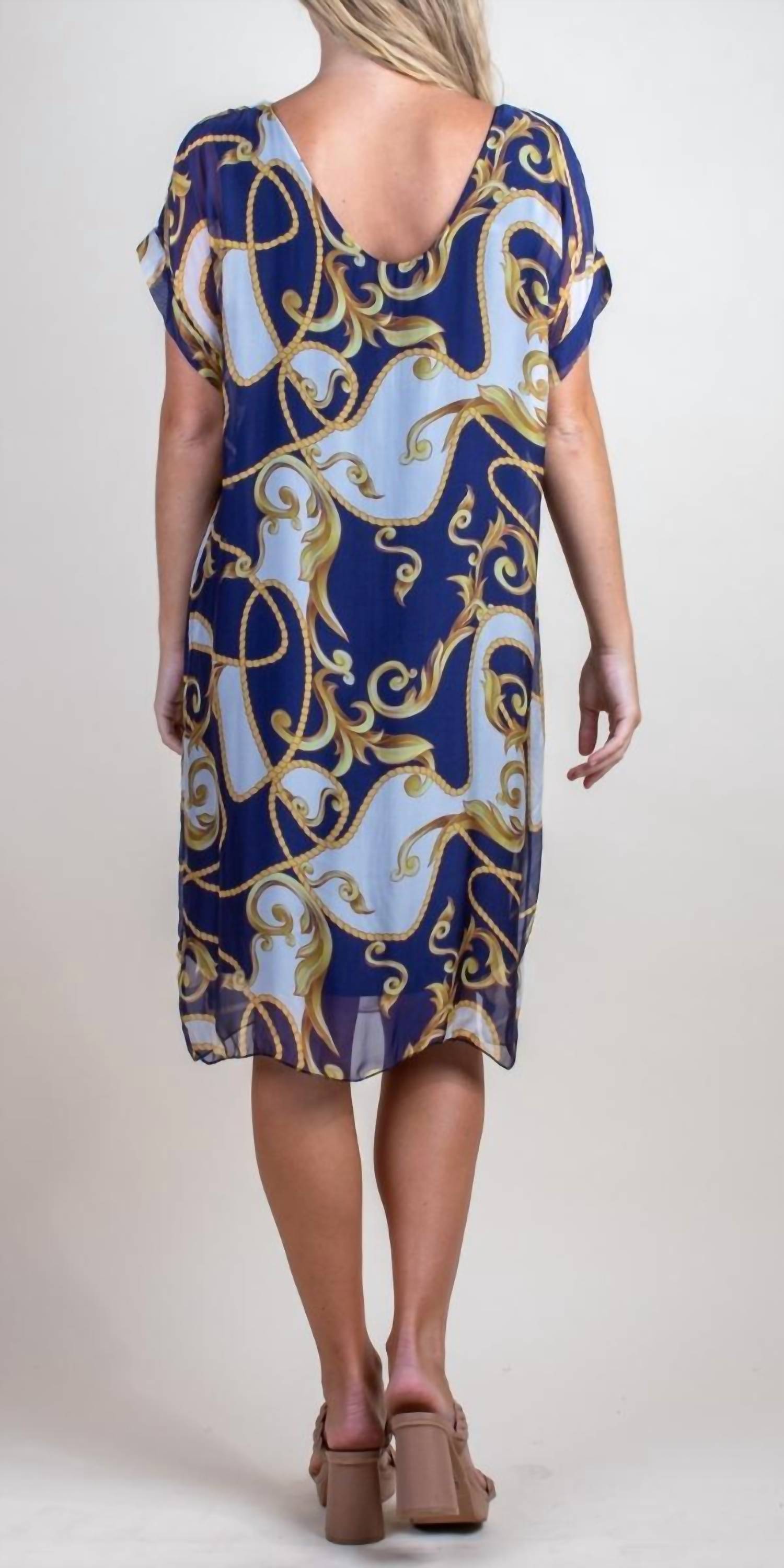Stunning mid-length shift dress perfect for any holiday party. With its luxurious baroque print on 100% silk. Features short sleeves and a sophisticated scoop neckline. Made in Italy. Offers a pull-on closure for ease of wear. Care instructions call for hand washing to maintain its elegant appearance.