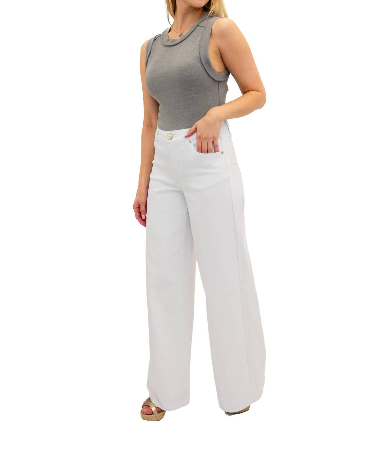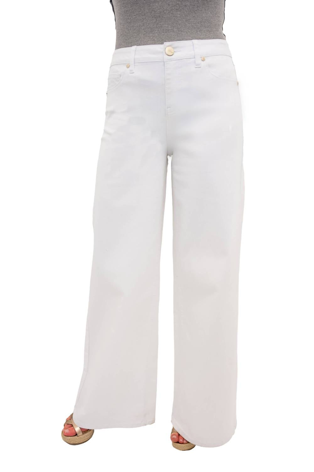 A flattering silhouette that's suprisingly versatile. Introducing the 33" Eco-friendly Wide Leg Jean by 1822 Denim in chic white, perfect for your spring and summer wardrobe. Crafted from a super comfortable recycled denim blend consisting of 65% cotton, 32% REPREVE® recycled polyester, and 3% spandex, these jeans feature a slim yet flattering wide leg profile with a slightly high waist rise. These eco-conscious jeans have a 33" inseam, 25" leg opening, and a 10 1/2" front rise, secured with a zip closure. Enjoy turning heads with their effortless style and sustainable fabrication.