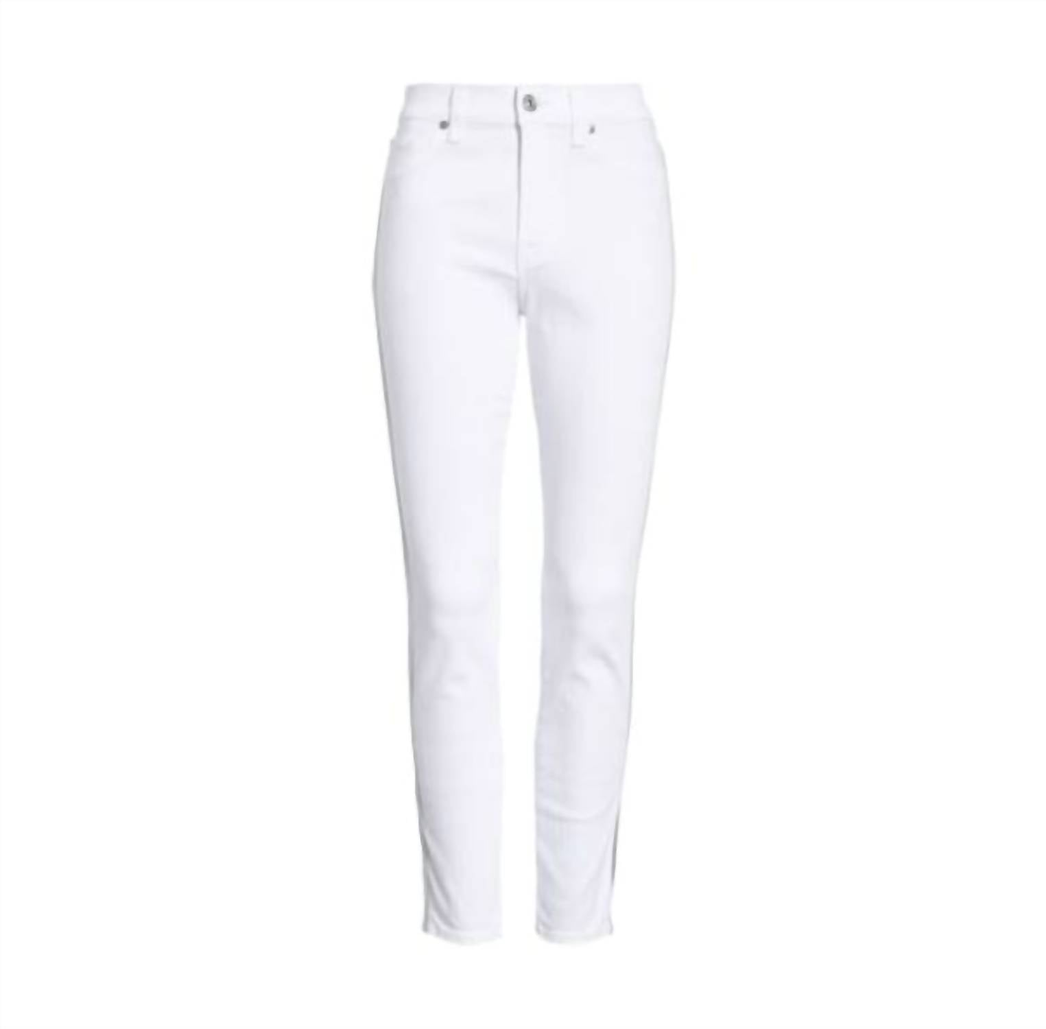 A skinny jean that is both flatering and comfortable. We love this style because it works great with boots, or without! 7 FOR ALL MANKIND Glitter Side Stripes High Rise Jeans Sparkly side stripes make a sporty-chic statement on bright white jeans that hug your figure from the high waist to the ankle-length hems Zip fly with button closure Five-pocket style 94% cotton, 5% polyester, 1% spandex Machine wash, tumble dry True to size Inseam 27.5"