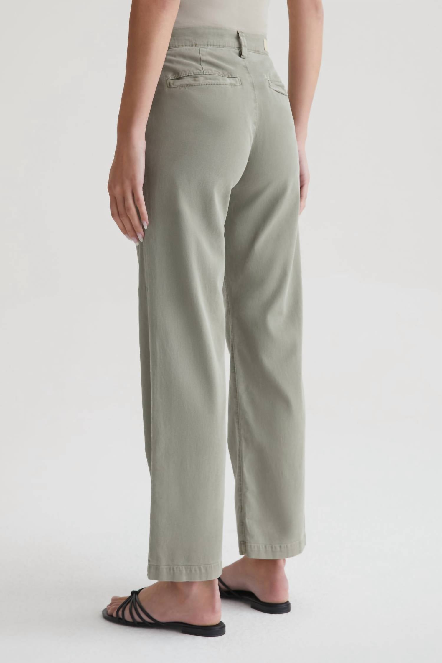 Elevate your wardrobe with the Caden Straight Leg Trouser from AG Jeans, tailored for women seeking effortless elegance. With a relaxed fit at the hips, these trousers are crafted from a luxurious blend of 60% Lyocell, 38% Cotton, and 2% Spandex in a sulfur-dyed green shade named Sulfur Dried Parsley. The trousers feature slant front pockets and welt pockets at the back, complemented by a convenient zip closure. Detailed with a front rise of 10.5", a knee opening of 19.5", a bottom opening of 18", and an inseam of 29", they promise comfort and style for any occasion.