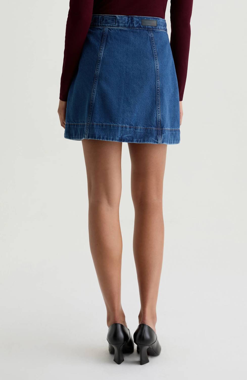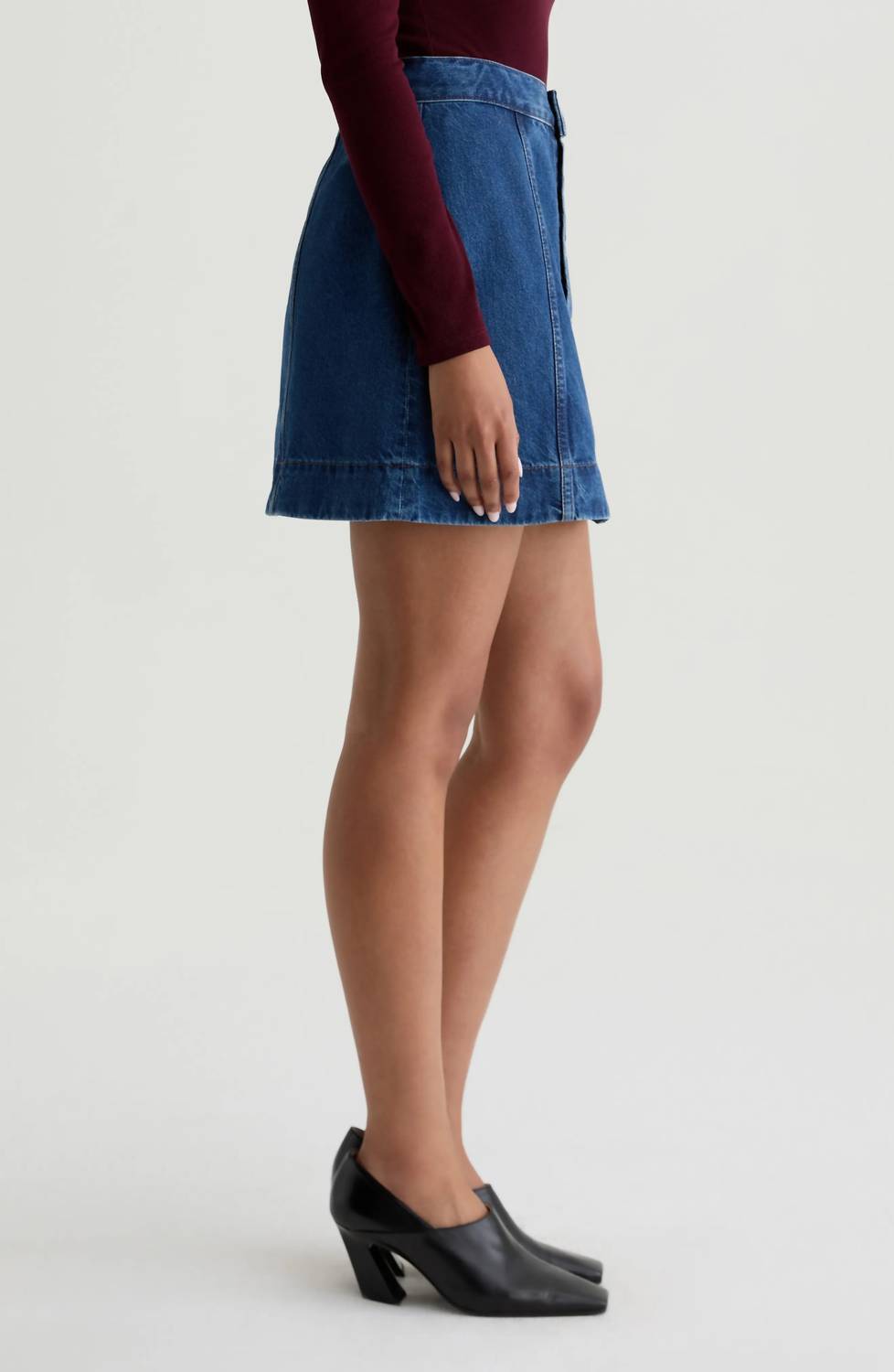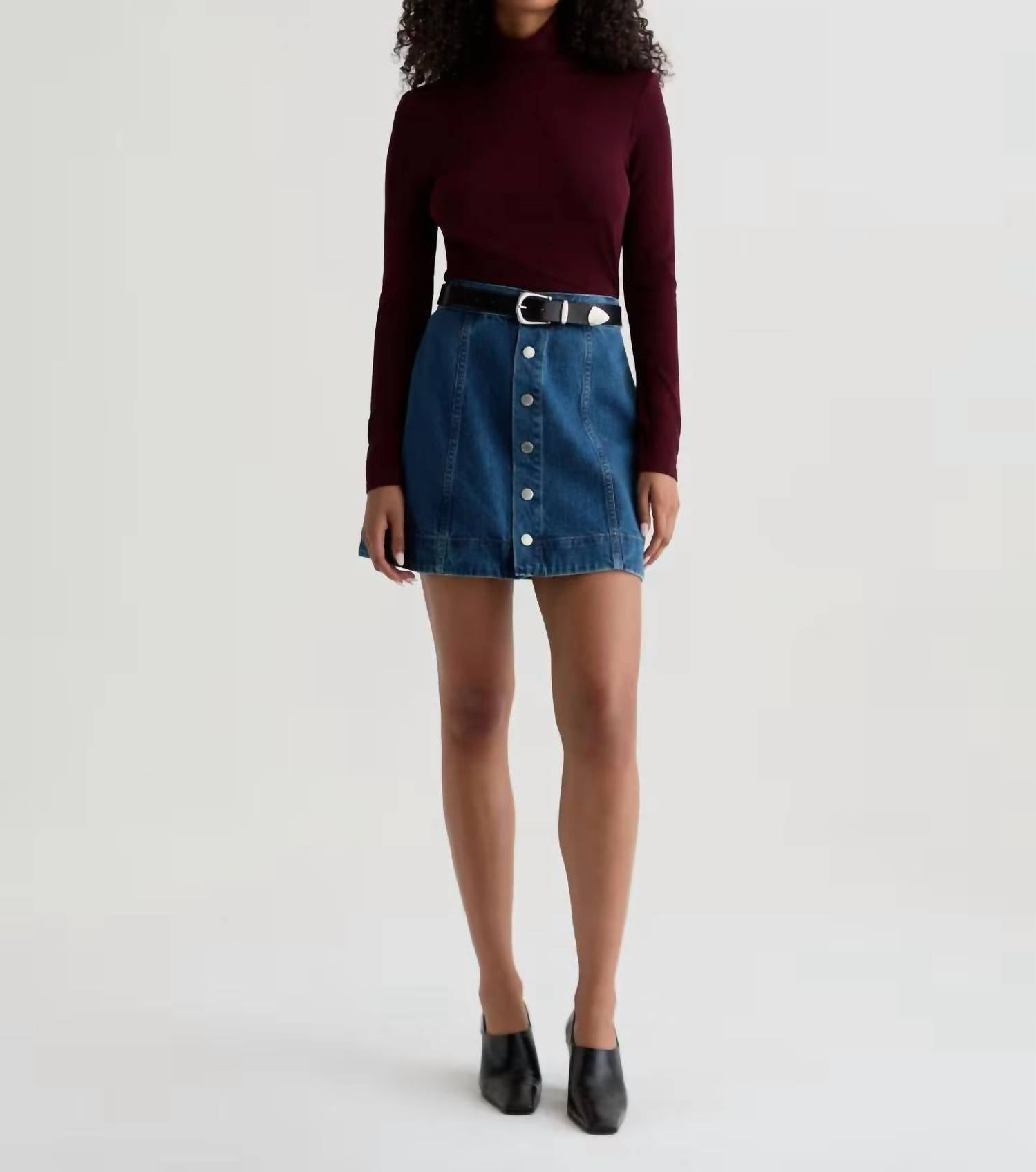 Elevate your fall wardrobe with the AG Jeans Evie Denim Mini Skirt, crafted from a cotton blend featuring 82% cotton and 18% lyocell. This A-line mini skirt in a solid blue is made with non-stretch denim for a structured, flattering feminine shape. The skirt measures 16 1/2" in length and has glossy front snap closures that add high-shine charm. It is imported and easy to care for with machine wash and tumble dry instructions.