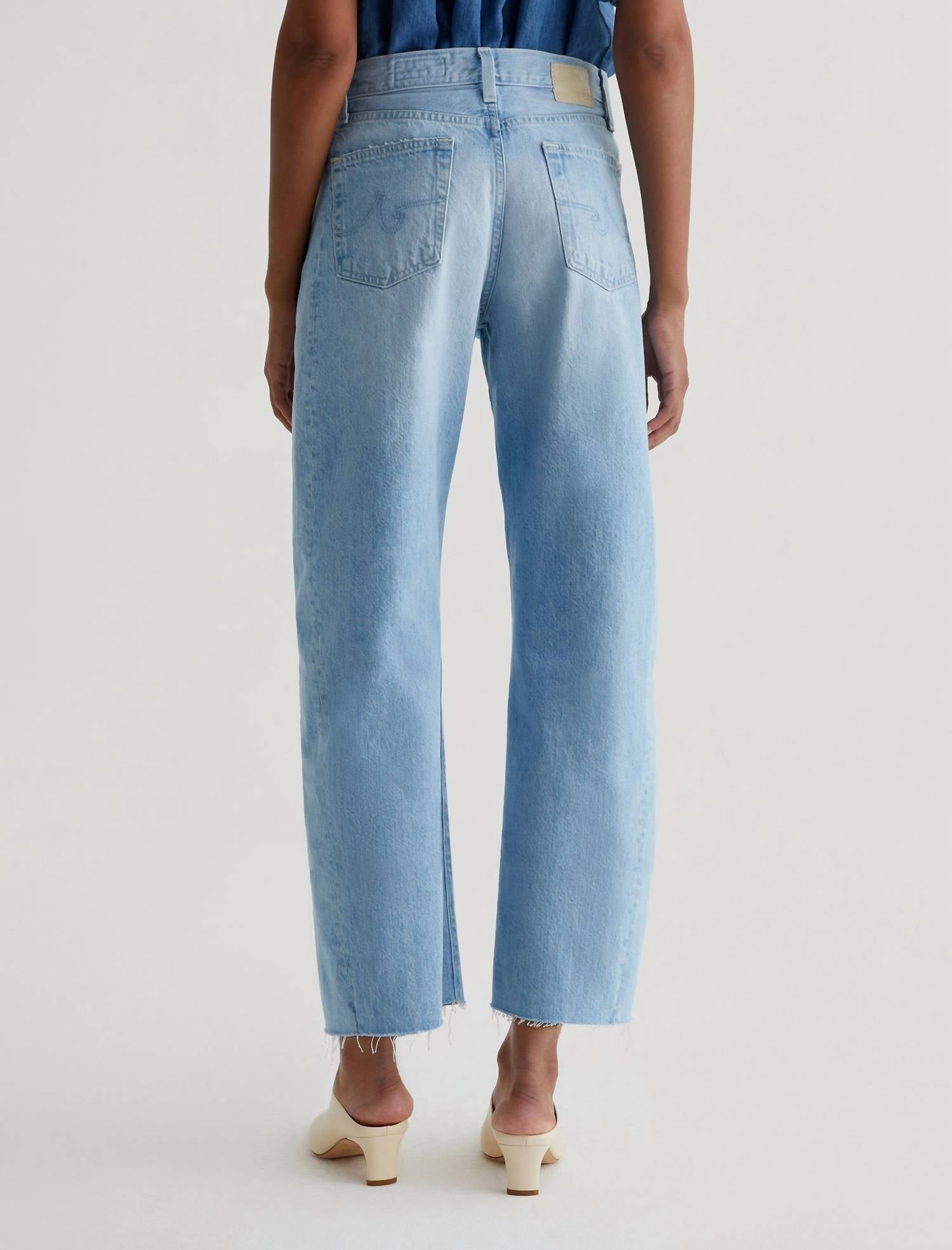 These must-have jeans are fit to perfection. Introducing the Hattie High-rise Barrel Crop Jeans by AG Jeans in a captivating Sunrise hue. These jeans feature an ultra-high rise with a front rise of 11.5" and a stylish barrel leg, complete with side-seam paneling and raw hems that rest just above the ankle. Crafted from 13 oz. Sioux Rigid Denim, they boast a durable 100% cotton composition with a light blue wash and subtle distressing for an effortlessly chic look. Machine wash. Model is wearing size 26 with measurements including an inseam of 26.5", a knee opening of 22", and a bottom opening of 18 3/4".