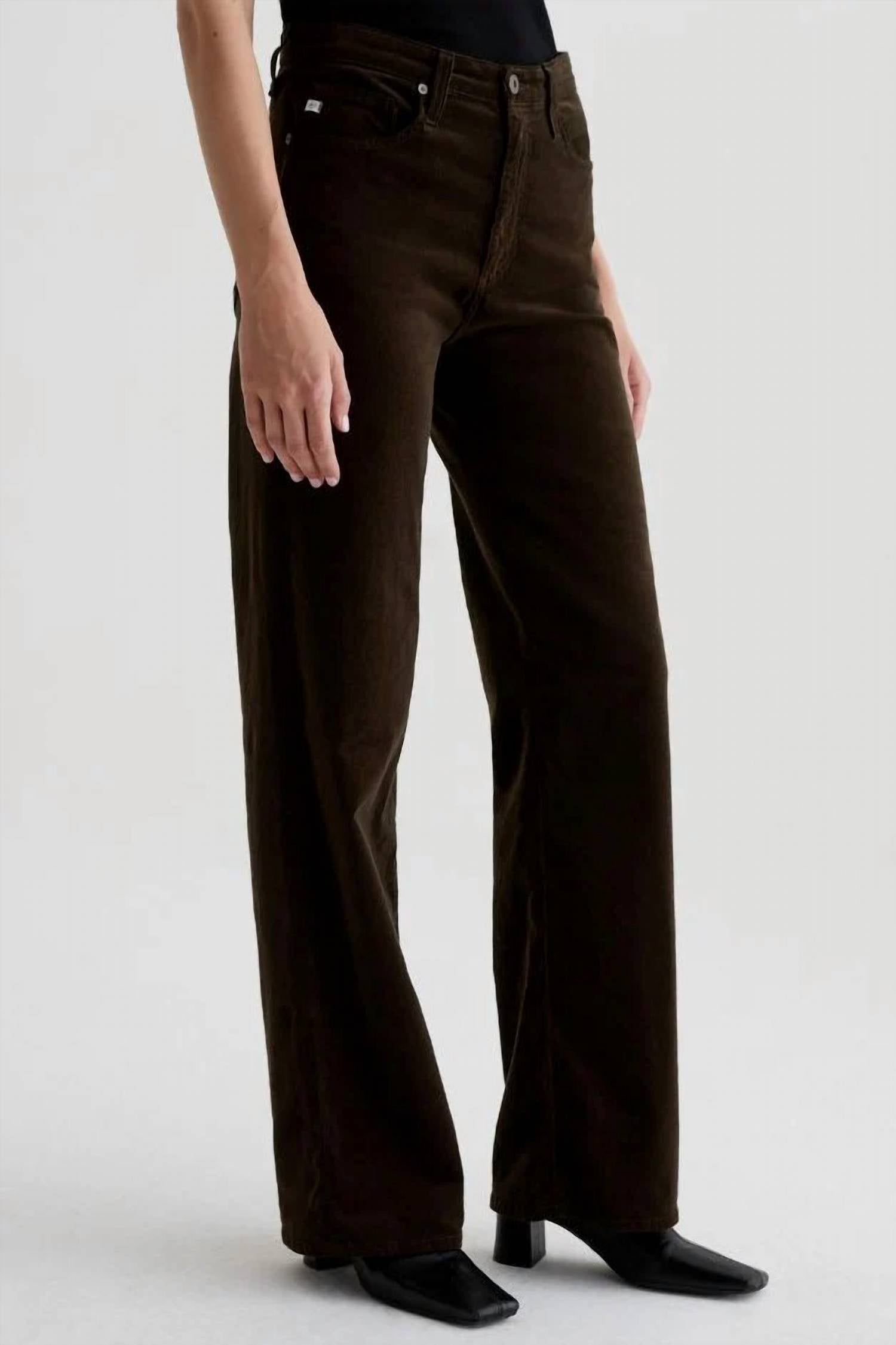 Step up your style game with the Kora High Rise Wide Leg Corduroy Jeans by AG Jeans. These women's jeans are made from a comfortable blend of 98% cotton and 2% elastane, featuring an ultra-high rise and a loose, easy fit through the legs in rich umber. The classic 5 pocket styling and wide leg design provide a modern twist to these solid-patterned jeans, crafted from soft mini corduroy. Closure: Zip closure. Care: Machine wash. With an inseam of 32 inches and a front rise of 11.5 inches, these pants offer both comfort and a flattering silhouette.