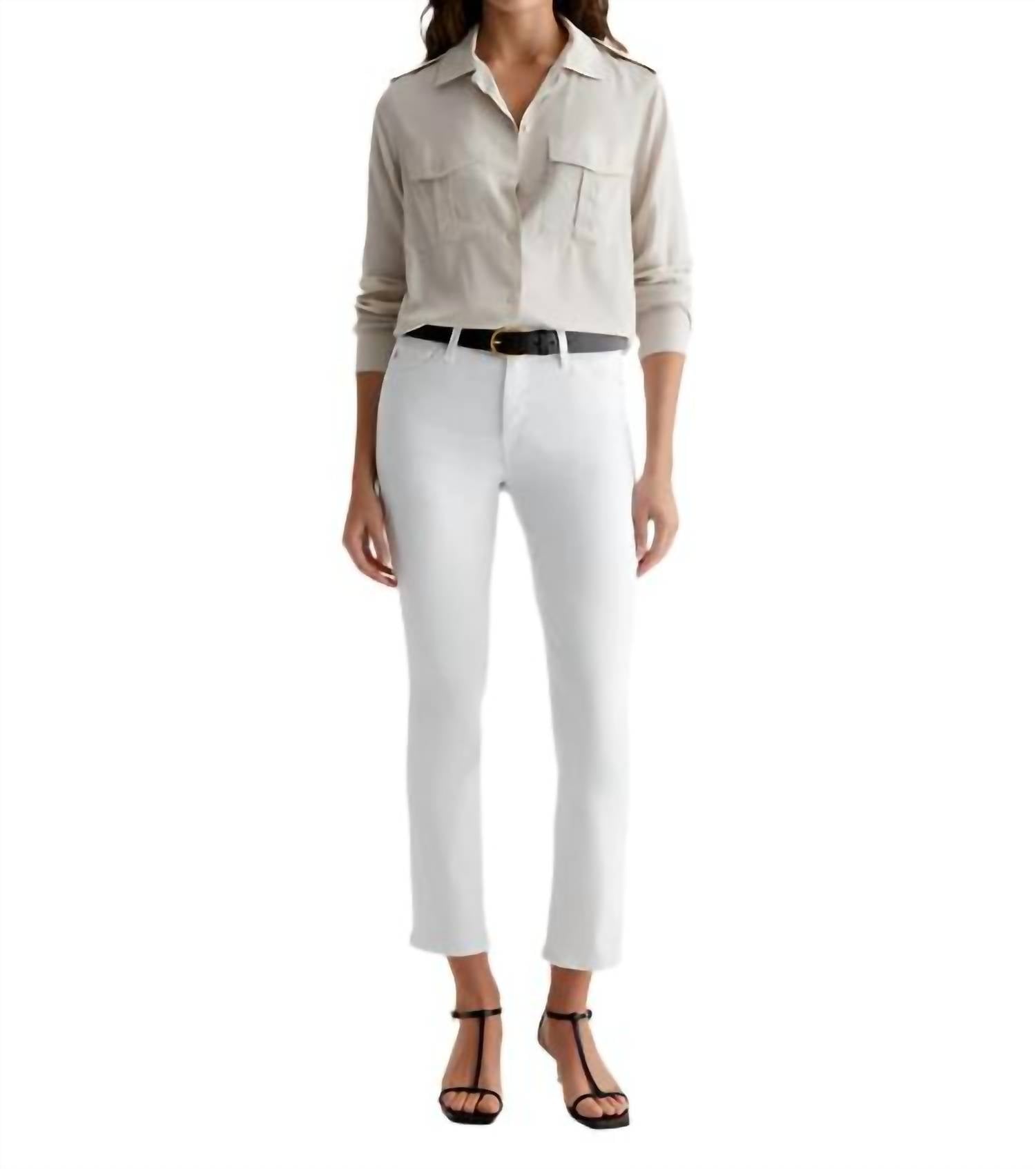 The Mari Crop is a mid-rise slim straight updated in bright white. These five-pocket jeans fit easy around the hips and feature a straight-leg silhouette with a slim, cropped finish. They're crafted from 10.25 oz. Cloud Soft Stretch Denim, an exclusive AG fabric with special left-hand twill construction that allows the yarns to gently relax and untwist for a luxe, supple feel. It's designed to get softer with every wear. Material: 93% Cotton, 5% Polyester, 2% Elastane.