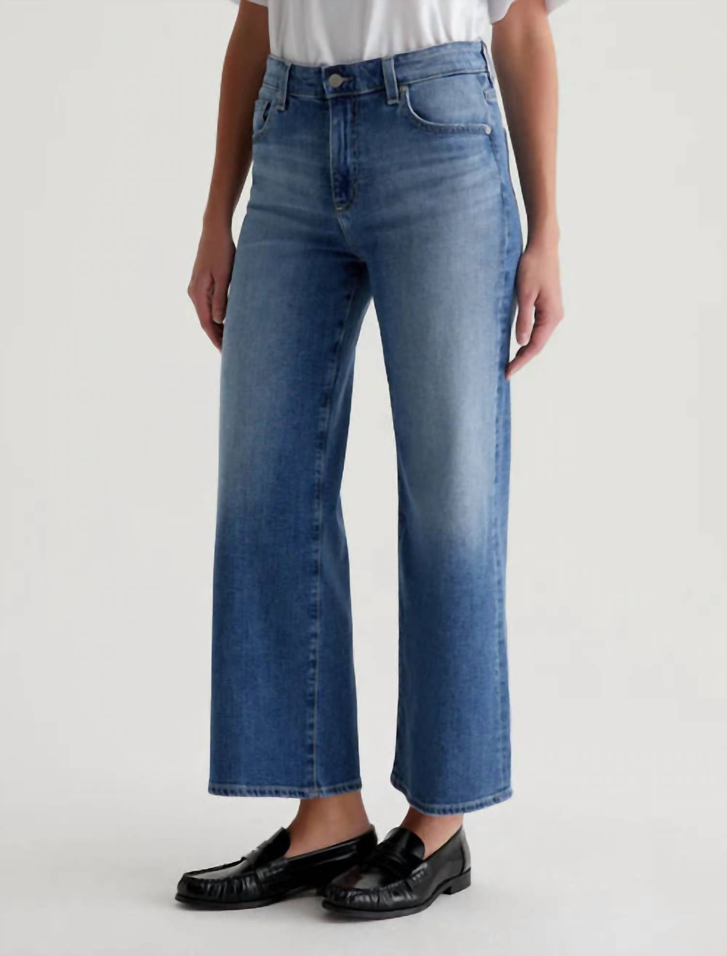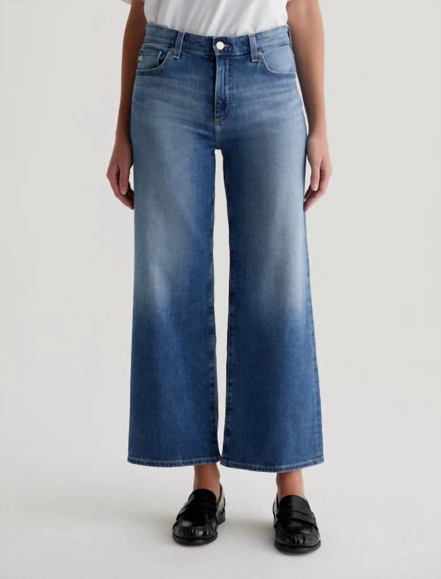 A flattering silhouette that's suprisingly versatile. Introducing the Saige Wide Leg Crop Jeans by AG Jeans, featuring a mid-rise waist and a relaxed fit in Gallery White. These women's pants are crafted from Cloud Soft Stretch Denim, a luxurious cotton blend (93% Cotton, 5% Polyester, 2% Elastane) that becomes softer with each wear. With wide, cropped legs and a button closure, they measure at a 10 1/4" front rise, 20 1/4" knee opening, 21" bottom opening, and a 27" inseam. Perfect for spring and 90s fashion trends, these versatile pants are designed for vacation or Thanksgiving occasions, and they are both machine washable and tumble dry friendly.