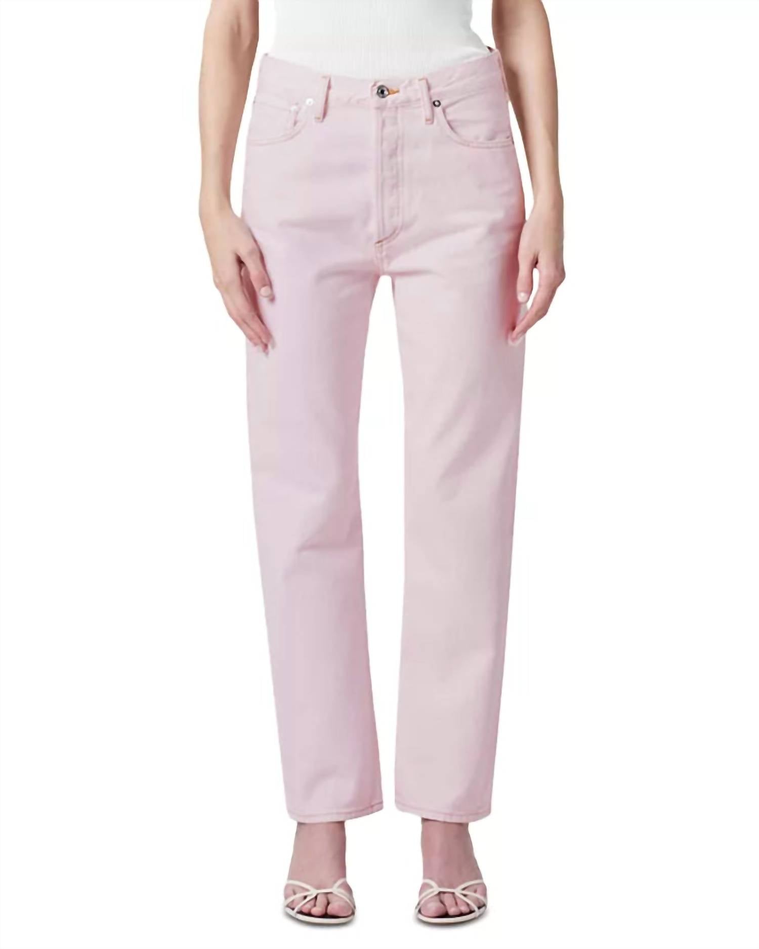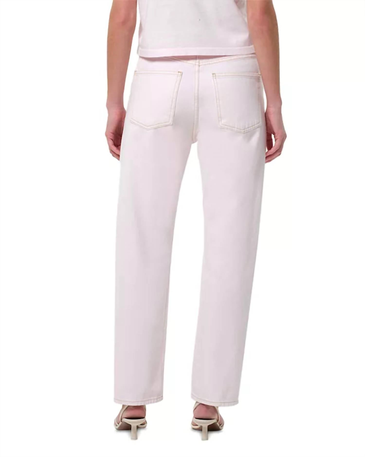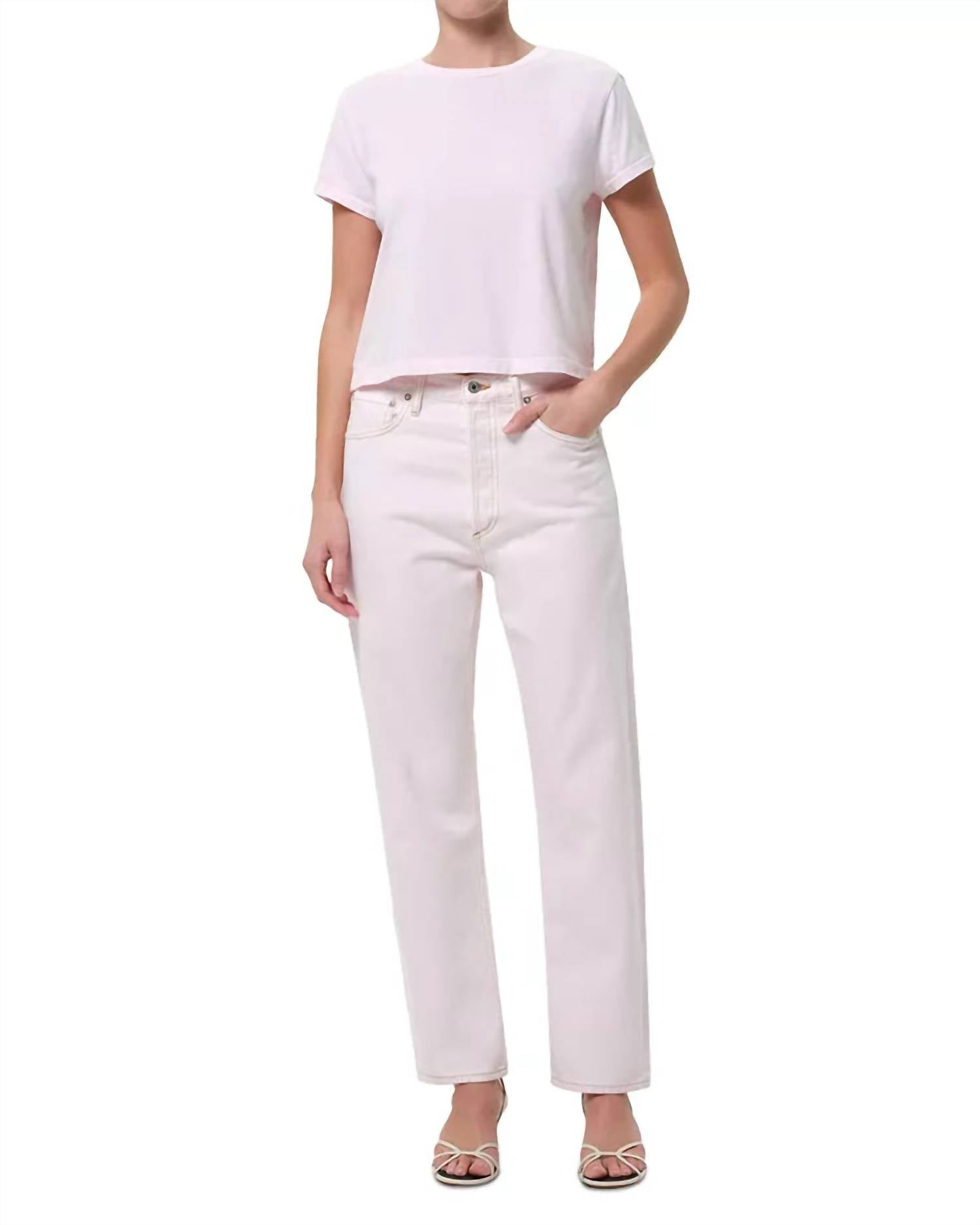 Pair these straight leg jeans with flats, sandals or even heels! You can't go wrong. Step back into time with the AGOLDE 90s Mid Rise Straight Jeans in Cosmos, offering a perfect tribute to the decade's loose-fit style. These light pink wash denim pants feature a mid-rise and relaxed fit through the hips, complete with a straight leg for a timeless silhouette. Made from 100% cotton, these jeans are crafted in the USA with imported materials, and feature a zip fly with button closure, silver-tone hardware, and a classic five-pocket silhouette. Care is simple with machine wash instructions, ensuring ease of maintenance as you break in this sturdy, non-stretch denim style.