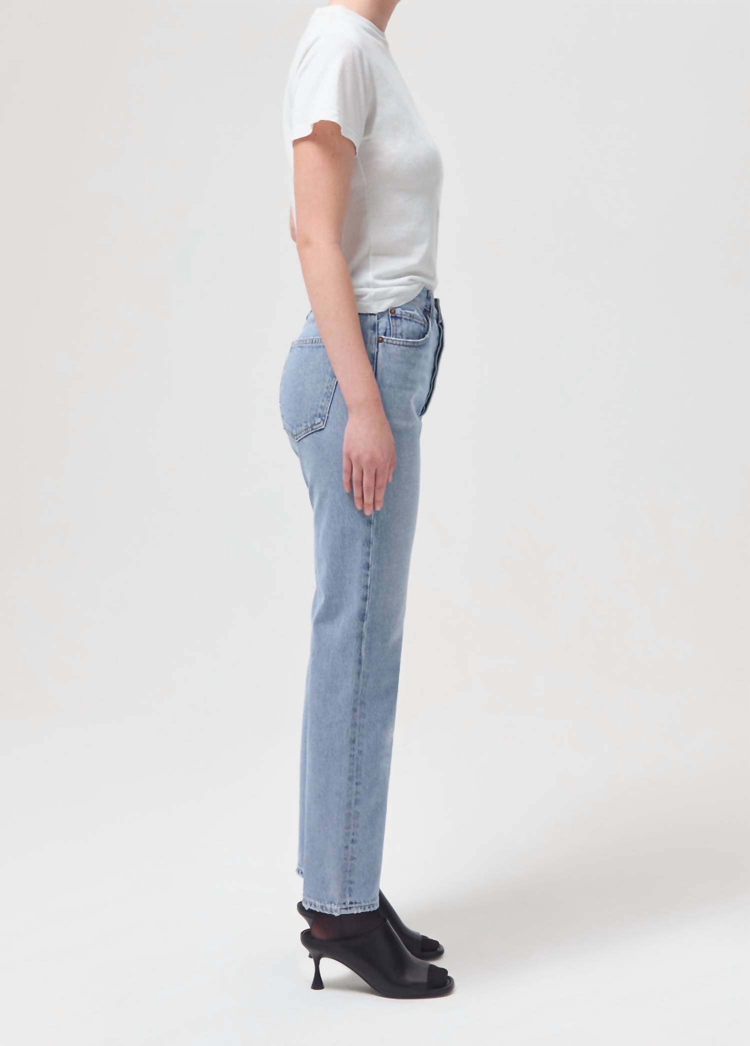These must-have jeans are fit to perfection. Discover the AGOLDE 90s Pinch Waist High Rise Straight Jeans in the captivating Soundwave hue, a quintessential piece for your wardrobe. These jeans boast a high-rise waist with a slim fit through the hips, enhanced by a classic straight leg and full-length inseam. Crafted from 100% organic cotton, they feature a zip closure and are designed with pockets for practicality. Perfect for pairing with various outfits, these light-wash jeans are easy to care for with machine wash and tumble dry instructions.