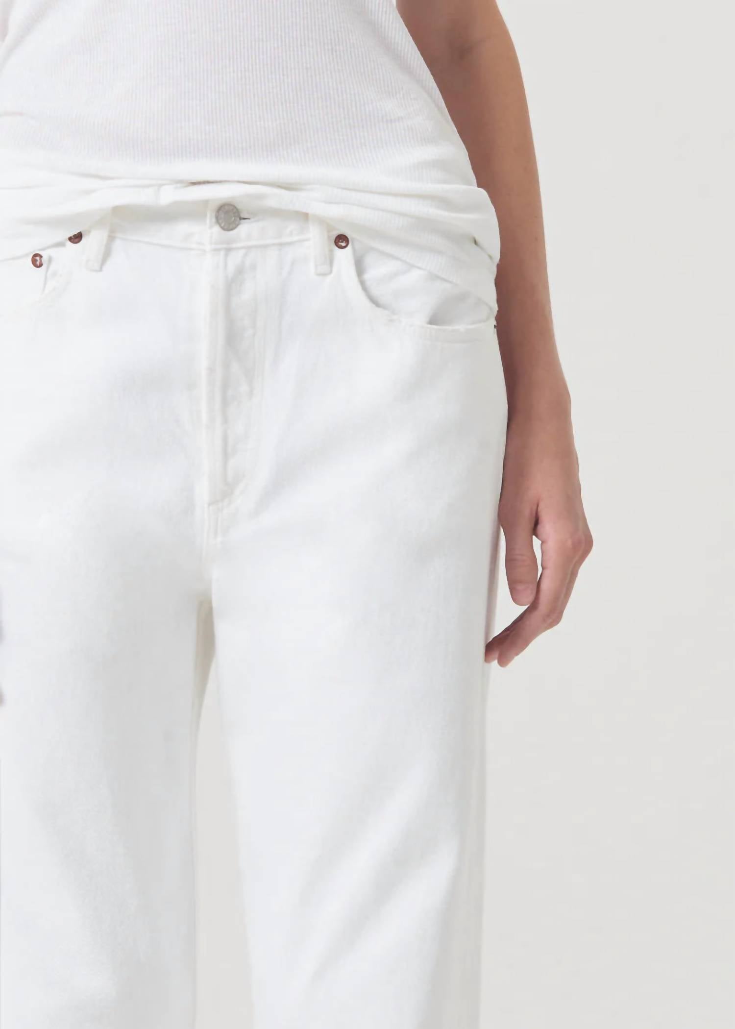 Discover the Fran Jean by AGOLDE, your go-to for a relaxed yet stylish look in the best-selling Milkshake color. Crafted from 100% organic cotton, these jeans feature a mid-rise fit with a relaxed leg finished in a straight cut. They include practical pocket design elements and a button closure to ensure both comfort and style. Dimensions: High rise 12.25", ankle inseam 27", leg opening 17.25". Care: Machine wash. Model is wearing a size 27 and stands 5'10" with 33" bust, 25" waist, and 35" hips.