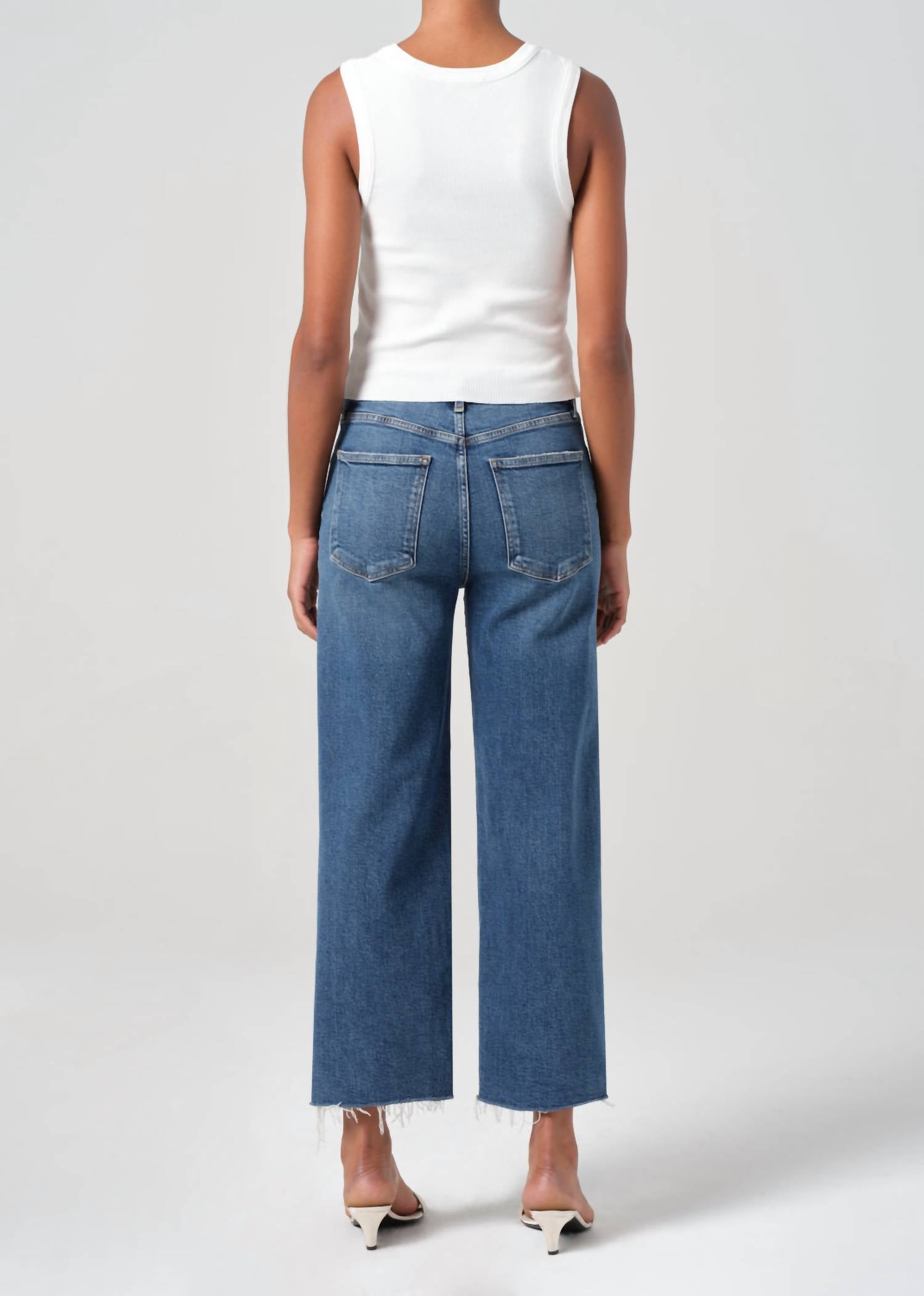 The perfect cropped jean for those transitional seasons. Introducing the Harper Crop Jean by AGOLDE, a stylish addition to any summer wardrobe. These women's jeans in the chic Motion color boast a mid-rise waist with a relaxed fit straight leg and an inseam of 27 inches. Made from a comfortable Cotton Blend, they feature a solid pattern with convenient pockets and a button closure for secure wear. Crafted in Turkey, they are easy to maintain with machine wash and tumble dry instructions, making them perfect for travel and streetwear occasions.