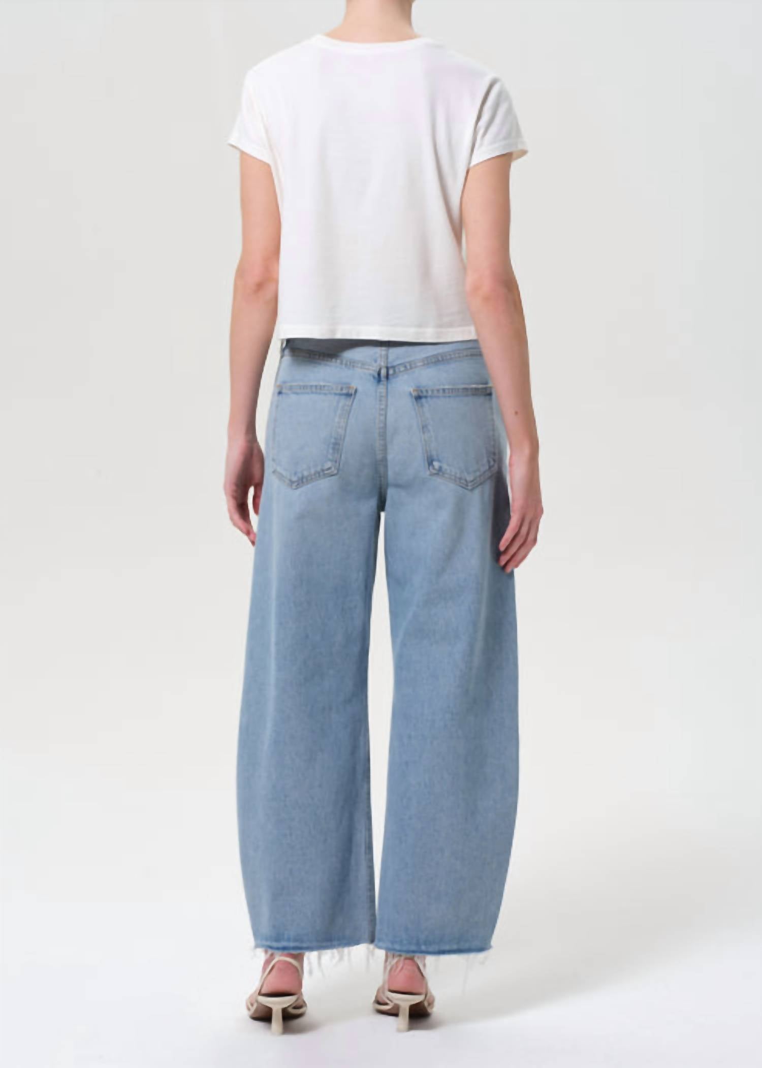 A flattering silhouette that's suprisingly versatile. Introducing the AGOLDE Low Curve Fray Jean in Force, an effortlessly chic piece perfect for warmer weather. Tailored with a cropped inseam of 27.5 inches, it features a frayed hem for a laid-back, vintage vibe. Made from 100% regenerative cotton, this solid medium wash denim boasts a zip closure, 11 3/4" rise, and a leg opening of 21". Care for this streetwear staple by machine washing cold inside out and tumble drying low to maintain its soft, rigid feel. Model is 5'10" and wears a size 27.