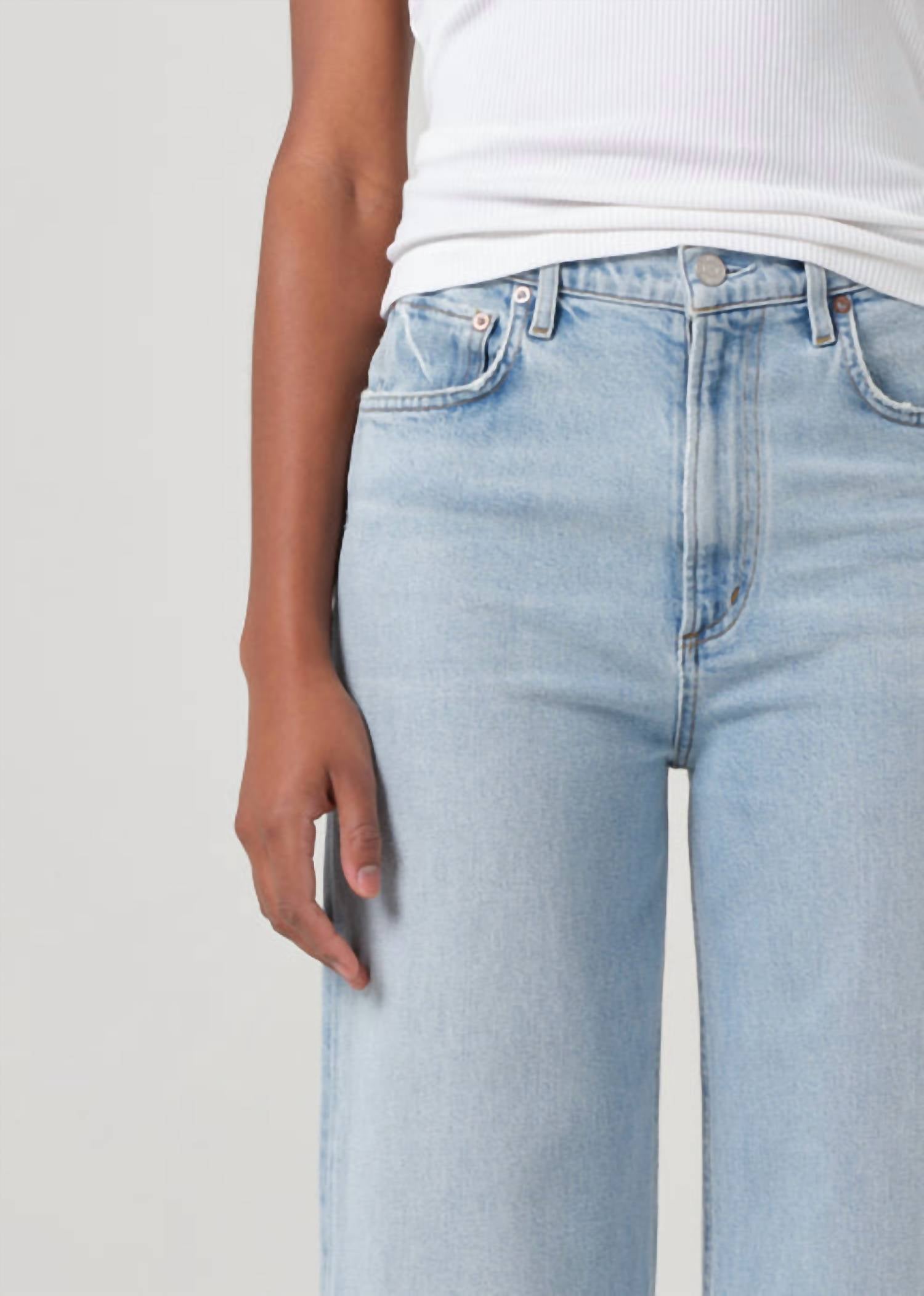 Introducing the Ren High-rise Jean by AGOLDE in a sophisticated Beam hue, perfect for those who appreciate the streetwear trend. This denim features a high-rise waist, relaxed fit through the hips, and a flattering wide leg with a light wash and raw hems. Made from 99% regenerative cotton and 1% elastane, these jeans offer a comfortable stretch for all-day wear. Closure: Zip closure. Care: Machine wash cold inside out with like colors, tumble dry low. Designed with a rise of 12 1/4", inseam of 27 1/2", and leg opening of 19 1/2", modeled by someone 5'10" tall wearing a size 27.
