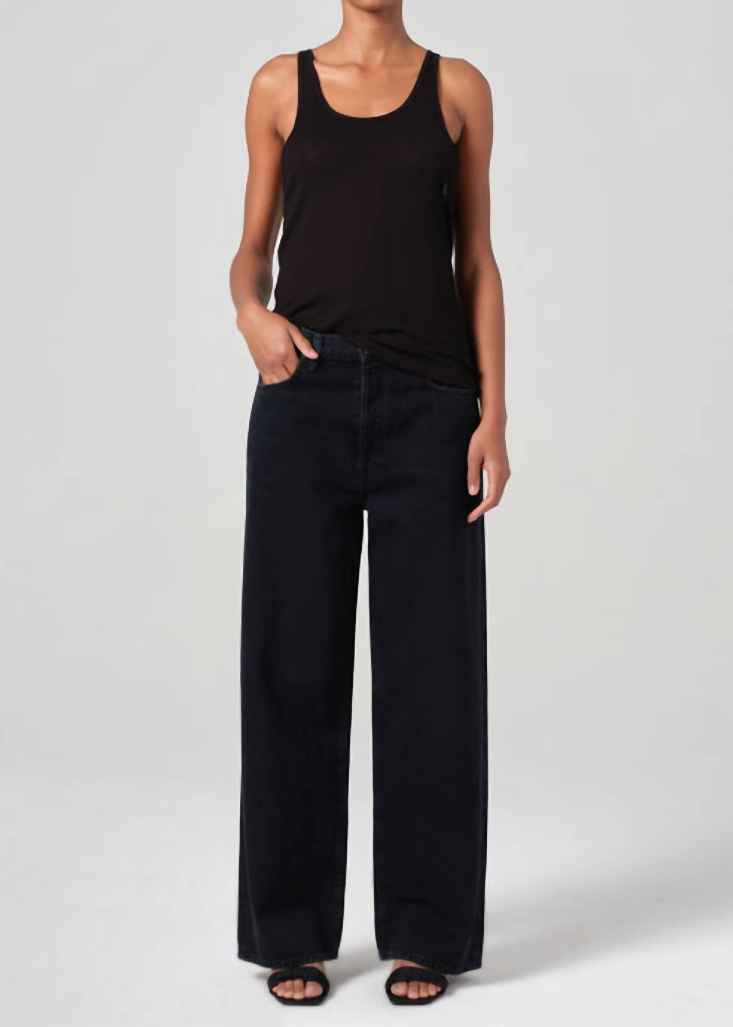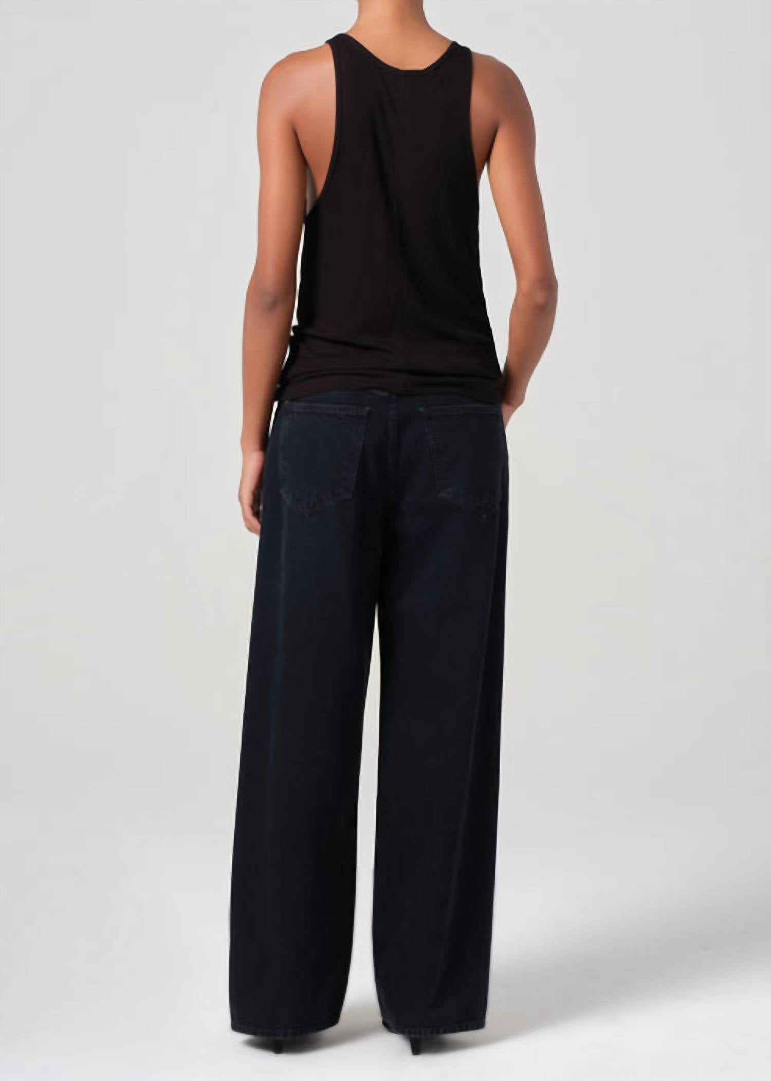 This style is designed with a relaxed, oversized silhouette that sits low on the hips and flows into a straight, baggy leg for an effortlessly flattering fit. Made from regenerative and recycled cotton, it combines structure with a graceful drape. Subtle fading and light whiskering add a naturally worn-in character, enhancing its casual yet refined appeal. Pair it with a fitted tee and boots for balance, or style with an oversized blazer to create a modern twist on relaxed tailoring. Key details include a button fly closure, a 12 ½" rise, 30 ½" inseam, and a 21" leg opening.