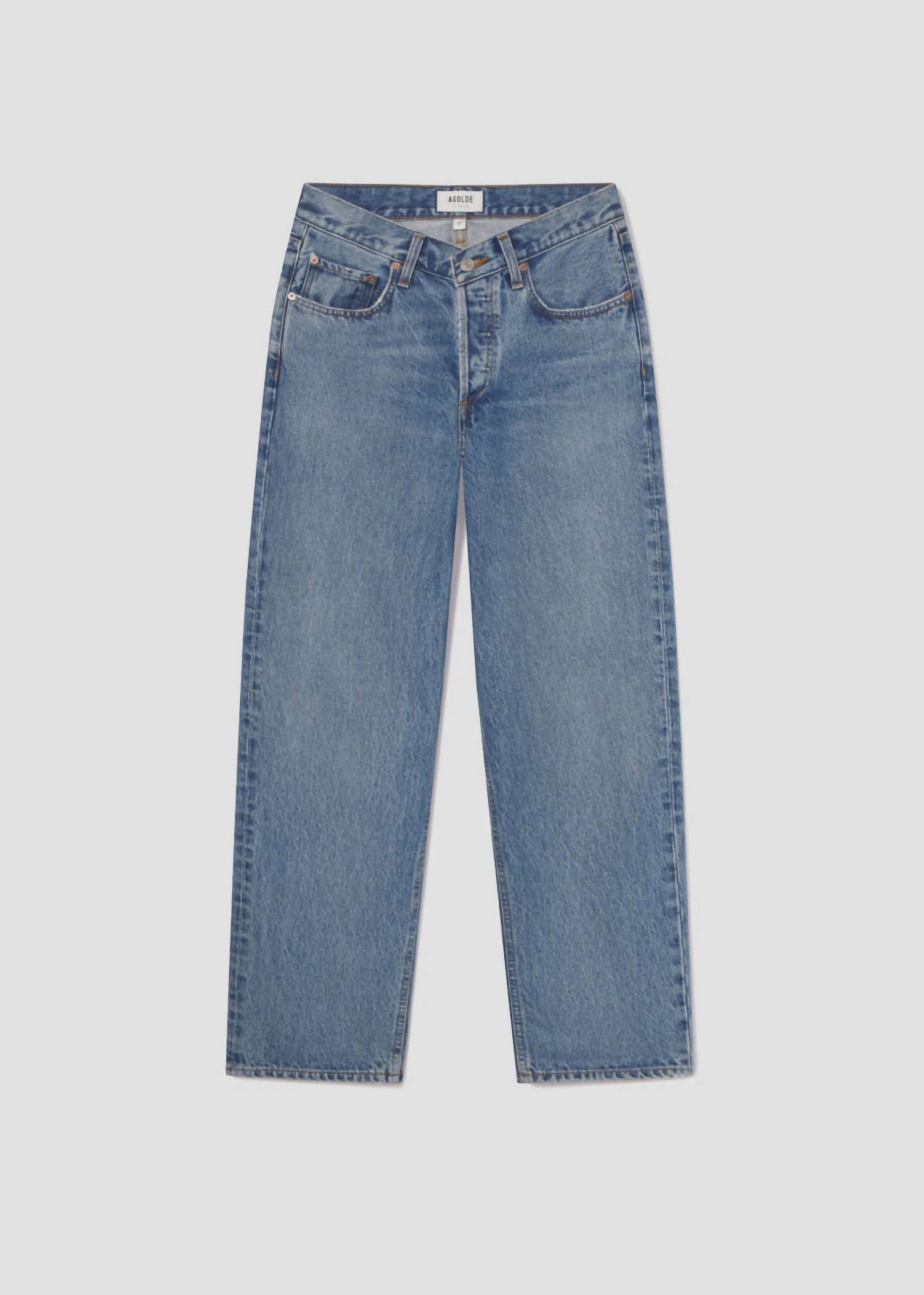 Pair these straight leg jeans with flats, sandals or even heels! You can't go wrong. Introducing the Women's V-Waist Baggy Jean by AGOLDE in Fairway, a chic addition to your denim collection. Crafted from a cotton blend composed of 67% regenerative cotton, 22% lyocell, and 11% post-consumer recycled cotton, this pair offers comfort with subtle stretch. Designed with a mid-rise waist, button fly closure, and a relaxed fit, these jeans feature a 30" inseam and a 17" leg opening. Made in Turkey, care for this timeless piece by machine washing cold inside out with like colors and tumble drying low. Model is 5'10" and wears a size 27.