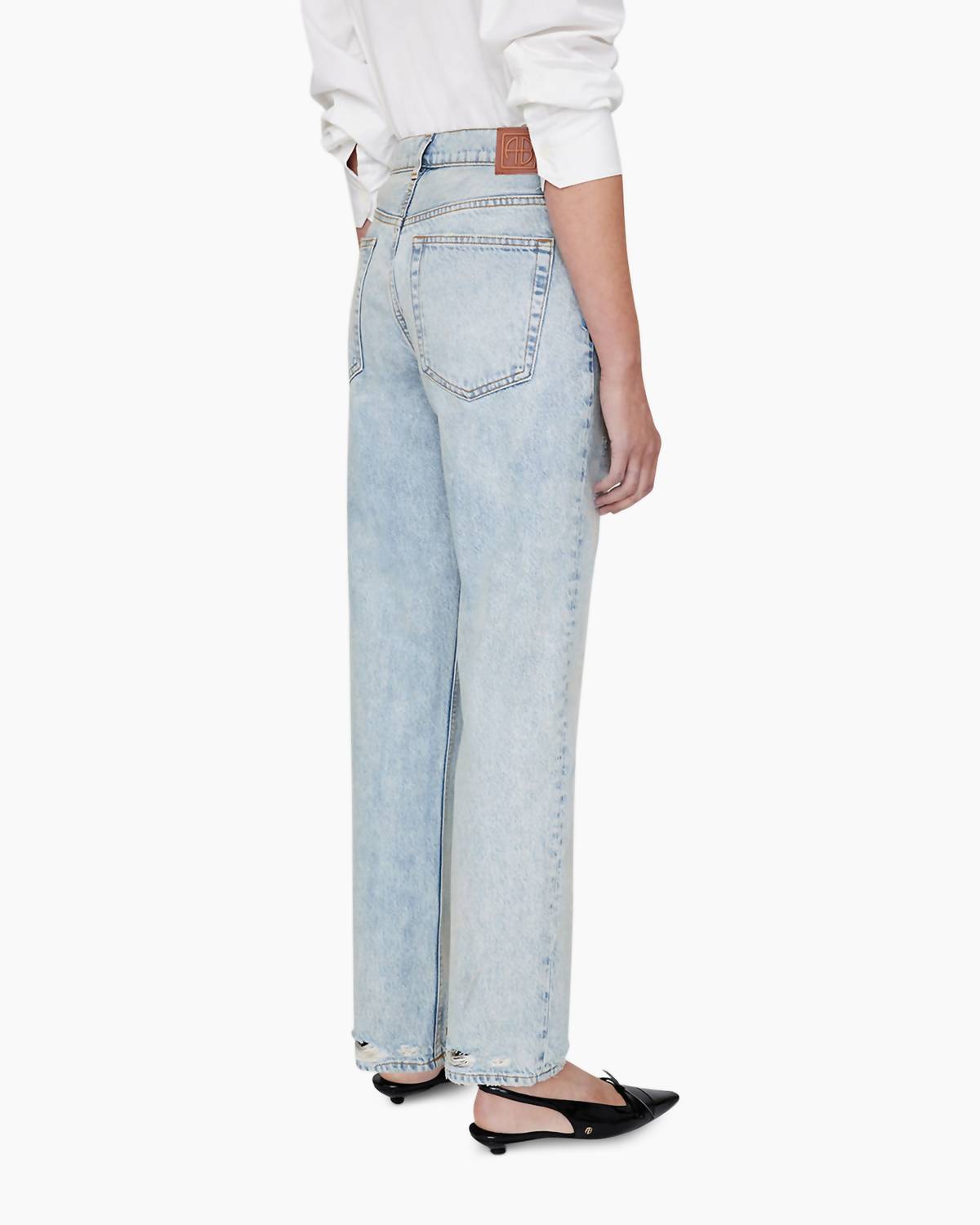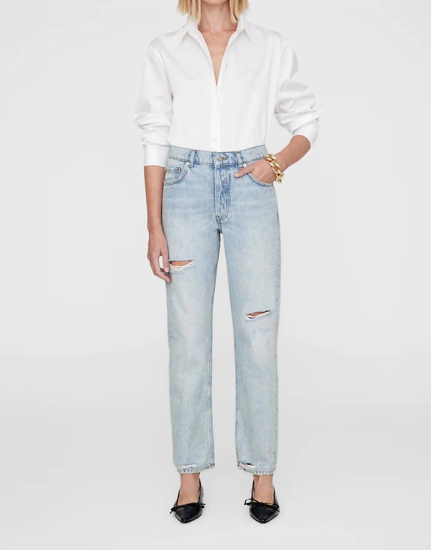 A skinny jean that is both flatering and comfortable. We love this style because it works great with boots, or without! Discover the Kate Bleached Jean by ANINE BING, an ideal choice for minimalist spring style. This women’s mid-rise jean is crafted from midweight regenerative cotton denim in a light blue wash, complete with a button closure for a secure fit. Designed with a regular fit, straight leg, and an ankle-length inseam, it offers a clean-edge hem with vintage-inspired details. Care instructions include machine wash and suitable for tumble dry, making it perfect for a dinner party or a casual outing.