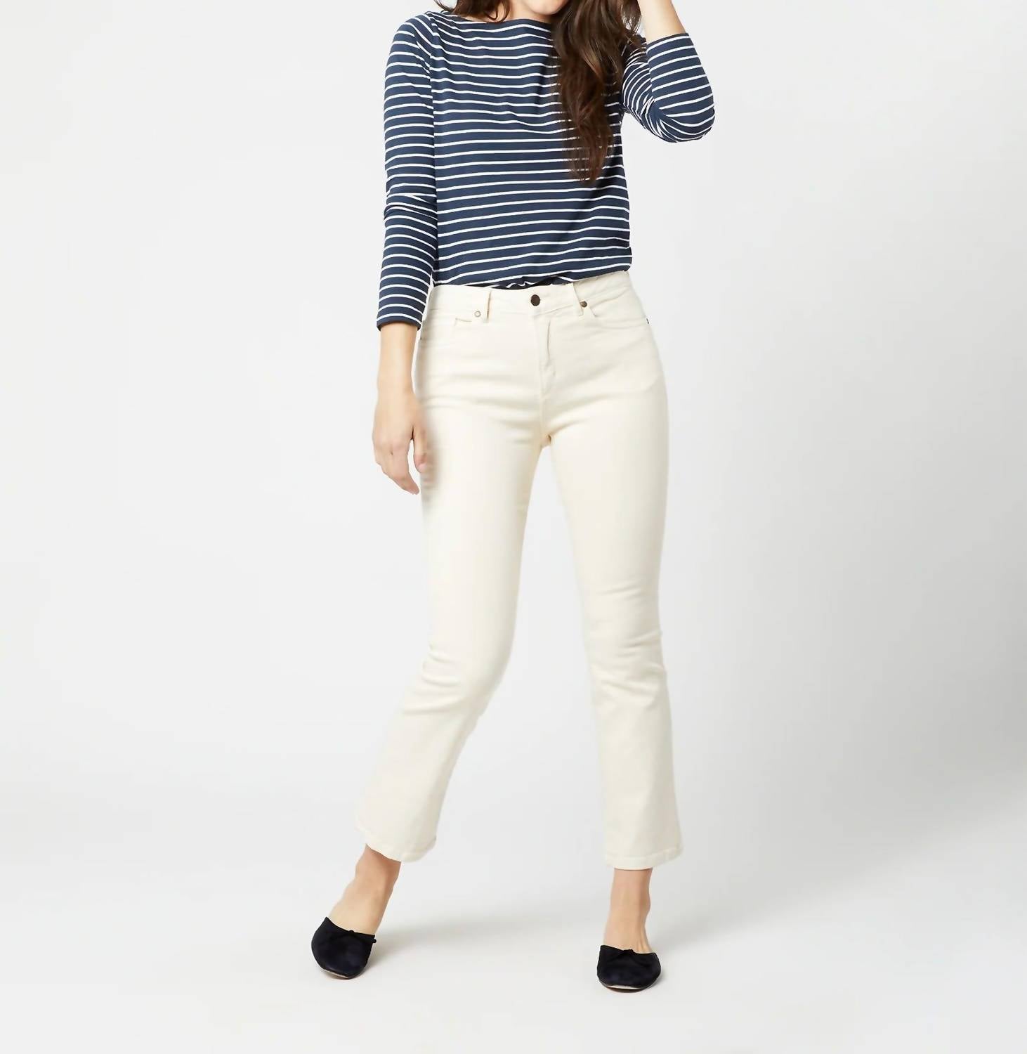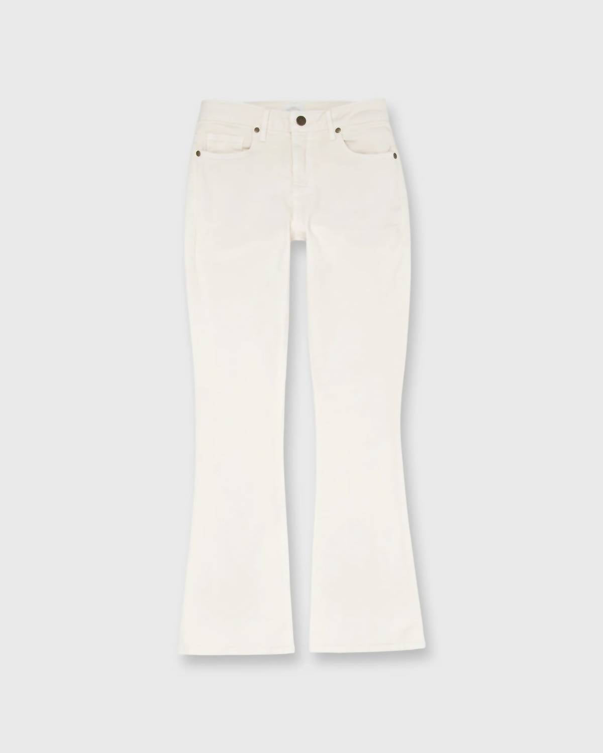 The perfect cropped jean for those transitional seasons. Presenting the Ann Mashburn Flare Cropped Jean, a sophisticated addition to your wardrobe in a timeless stone hue. Made from Cone Mills stretch denim, this slim-fit jean features a mid-rise with an 8.5" rise, a 27" inseam, and a 16" leg opening for a flattering silhouette. Crafted from a cotton blend of 88% cotton, 10% polyester, and 2% elastane, it offers optimal comfort with a 5-pocket style and a zip closure. Proudly made in the USA, care includes machine washing cold inside-out and low tumble drying. The model is 5'6" and wears a size 25.