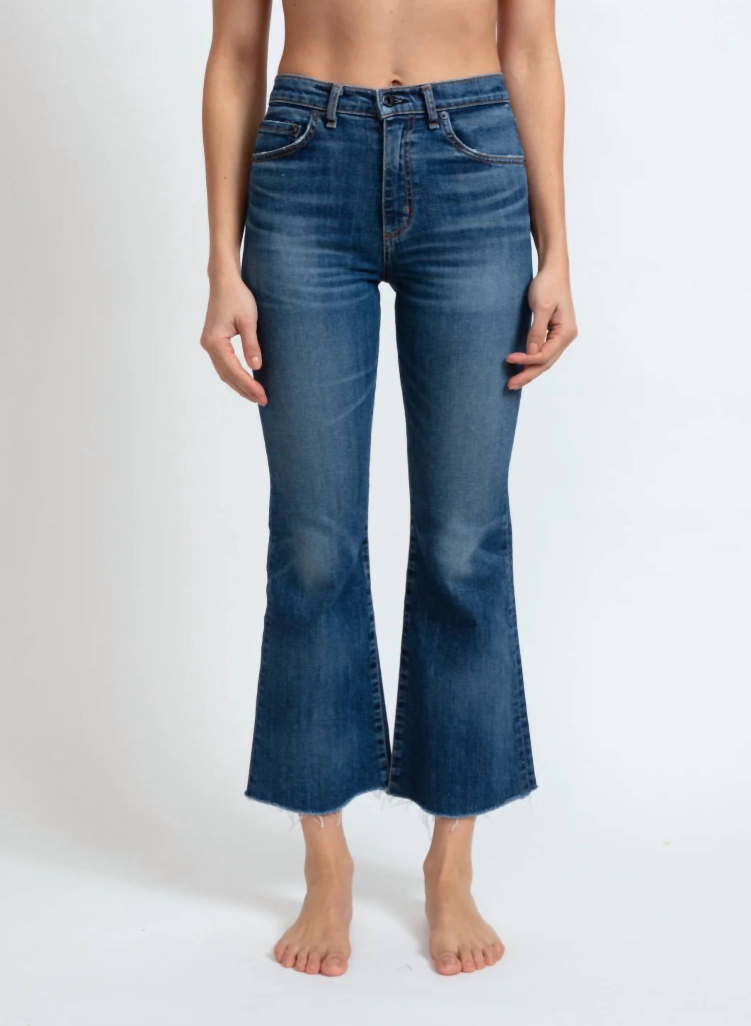The perfect cropped jean for those transitional seasons. Presenting the Geek Ankle Flared Jeans by ASKK NY, a must-have for any streetwear enthusiast. These high-rise jeans feature an ankle-length crop boot design with two-tone panel detailing and a slim fit flared leg. Crafted from 98% cotton and 2% PU in 10 oz. Japanese denim, the jeans come with a side zipper closure and are made in Los Angeles. Care instructions include machine wash cold separately and avoiding tumble drying. Dimension specifications: 11" rise, 28" inseam, 20" leg opening. Model Tais is 5'7" and wearing a size 25.