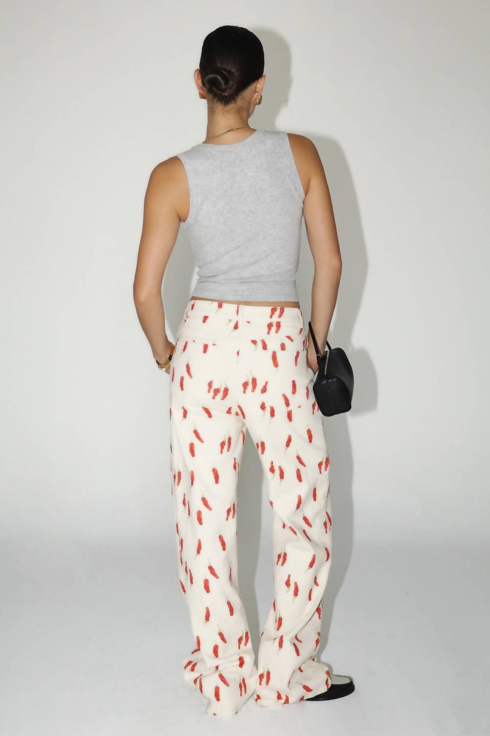 Introducing the Chili Jeans by Bailey Rose, a bold addition to your wardrobe designed to make a statement. These high-rise jeans feature a wide leg design adorned with a fiery chili pepper print, perfect for a standout summer look. Composition: 97% Cotton, 3% Spandex. Closure: Button closure. Made in China. Care: Hand wash cold and lay flat to dry, or line dry.
