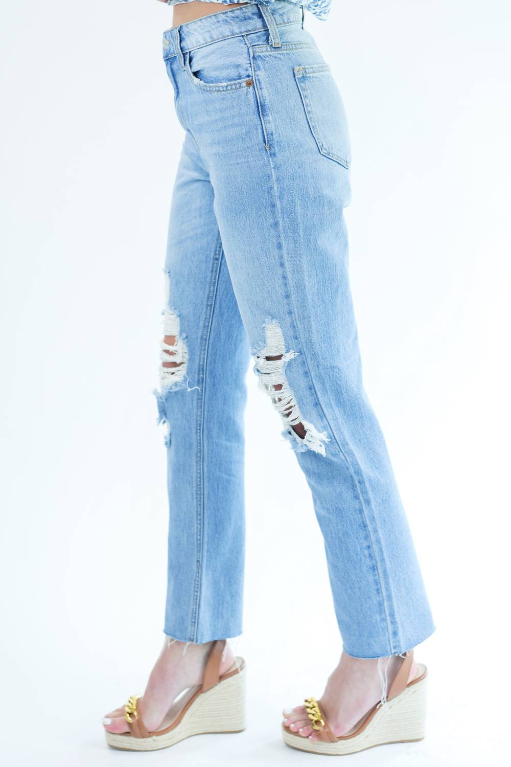 The perfect cropped jean for those transitional seasons. Introducing "The Hilton" Light Denim Jeans by CELLO, a stylish staple in light blue that transitions effortlessly through the seasons. These high-rise jeans feature a relaxed fit with a straight leg and ankle-length raw hems, perfect for a streetwear-inspired look. Crafted from 100% Cotton, they boast distressed detailing, a five-pocket design, belt loops, and a hidden zip with a button closure for simplicity. Model is a US size Small, wearing size 3 for a looser fit, and stands at 5'11" with a bust of 31", waist of 26", and hips of 37".