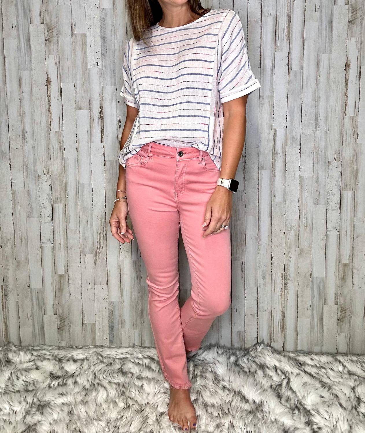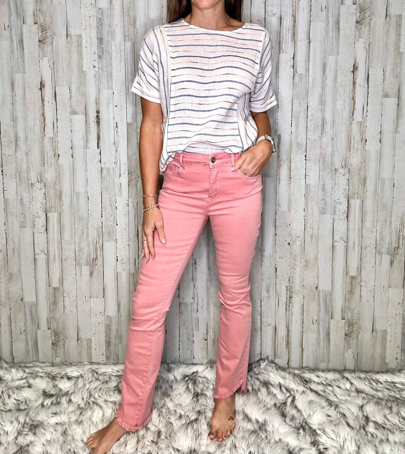 Experience spring and summer bliss with the Looking Cute Bootcut Jeans by Charlie B, crafted in a vibrant Tulip hue. Designed for travel-ready style, these solid-colored pants boast a flattering mid-rise waist and bootcut leg with an asymmetrical opening and frayed hem. Made from 98% Cotton and 2% Spandex, these jeans offer a comfortable stretch and pull-on closure for effortless wear. Care: Machine wash cold on a delicate cycle, do not bleach, hang to dry, iron on low, or dry clean.