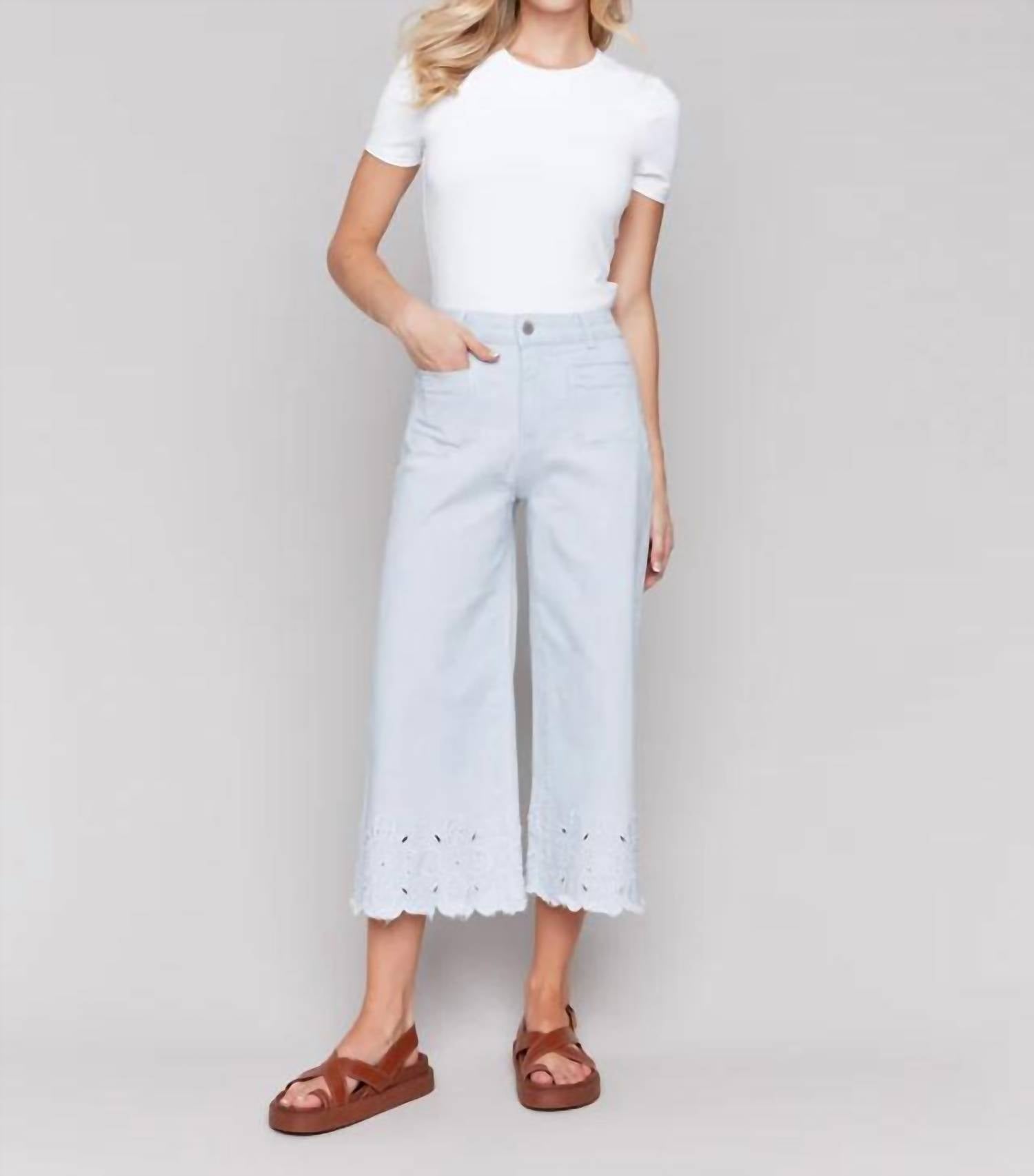 Experience modern elegance with the Wide-leg Cropped Jeans With Scallop Embroidered Hem by CHARLIE B, perfect for adding a playful touch to your spring wardrobe. Crafted from a cotton blend with 97% cotton and 3% spandex, these striped, wide-leg pants feature a cropped length and a regular rise, complemented by a chic scallop embroidered hem. The stretch denim material is both luxurious and versatile, making these pants an ideal choice for any occasion, pairing seamlessly with both sneakers and heels. Featuring two front pockets, two back patch pockets, and a convenient button closure, they offer a stylish solution for travel and beyond. Care is simple with machine wash in cold water on a delicate setting, hang to dry, and iron at a low setting if needed.