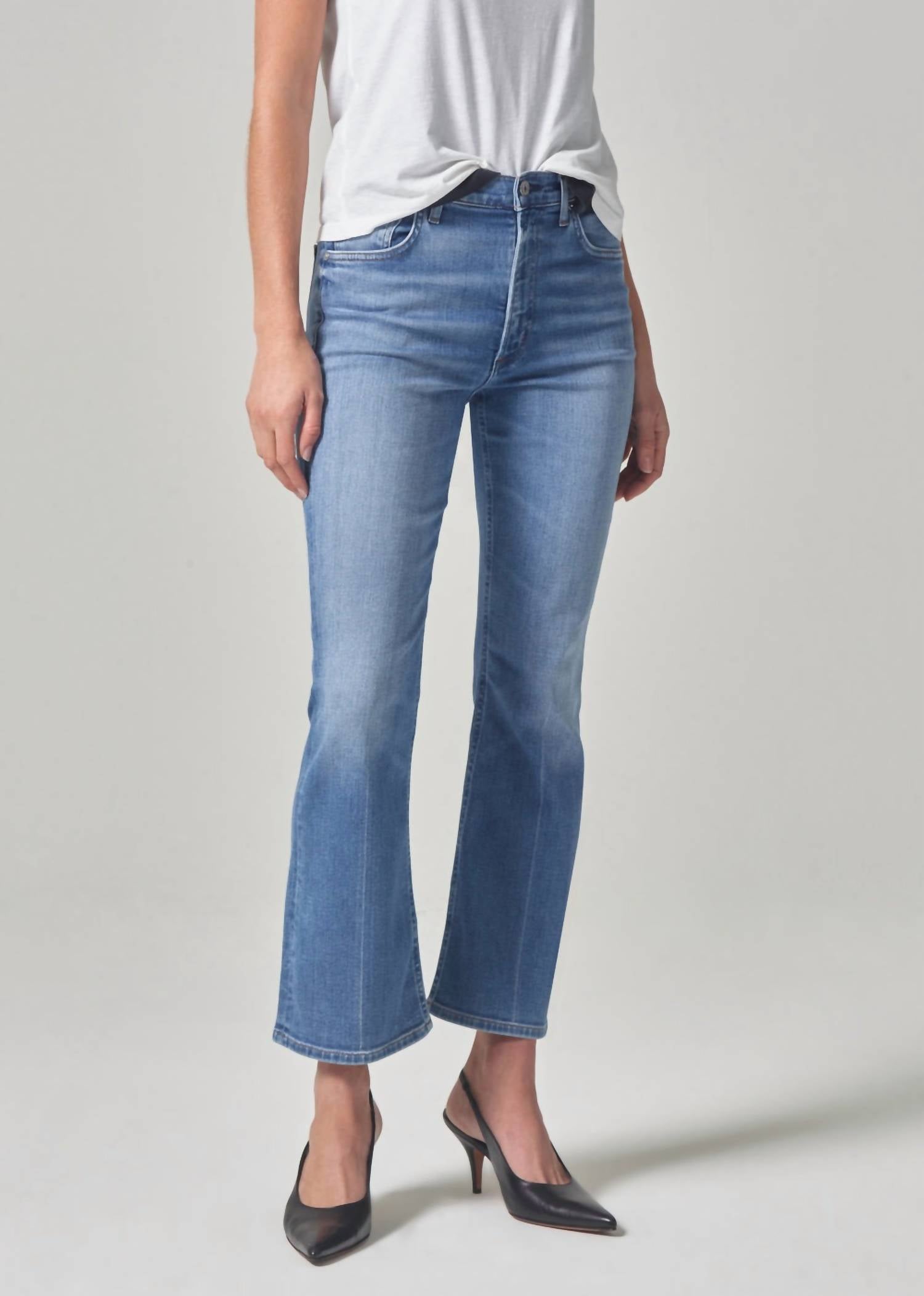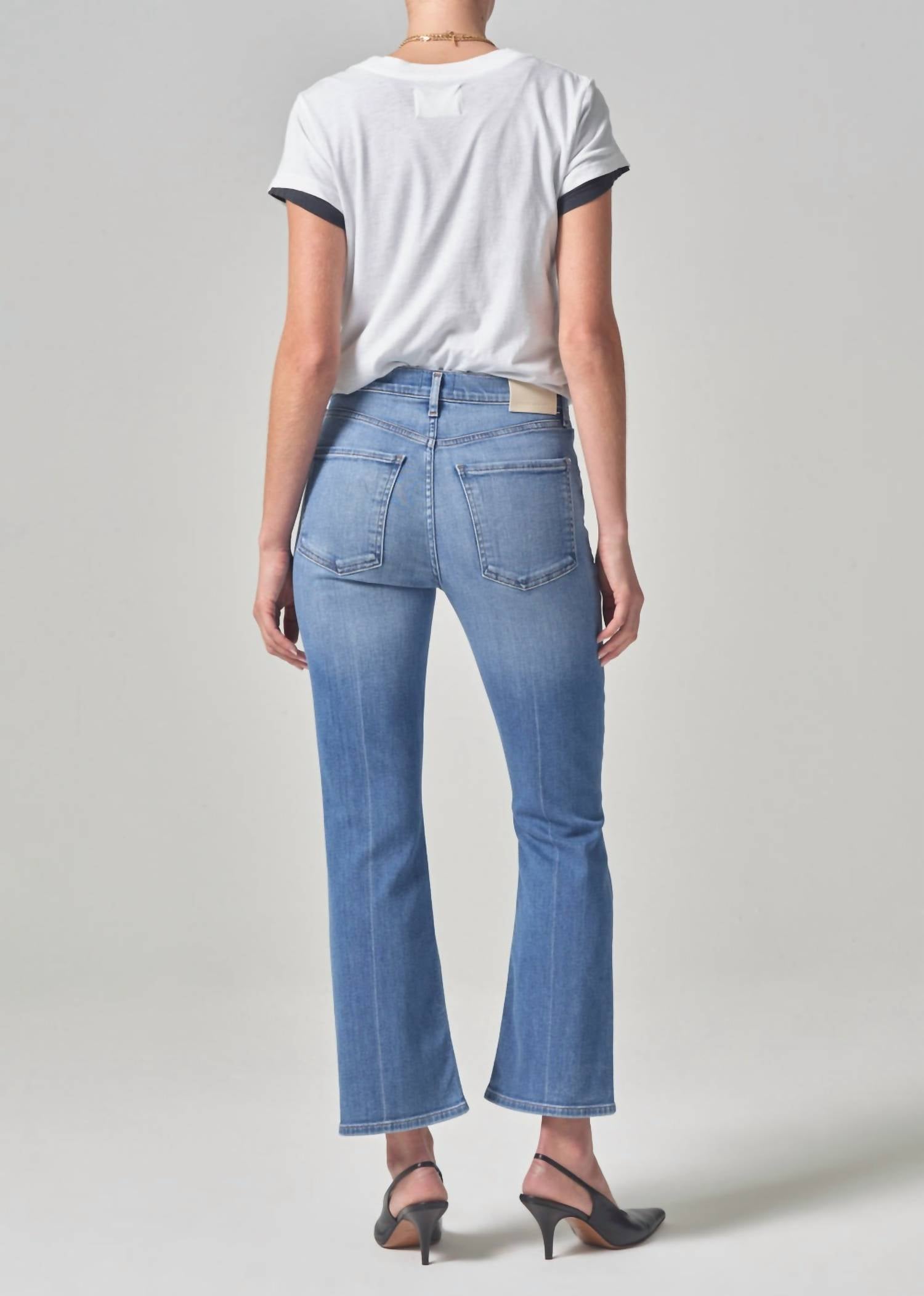 If you're looking for boot-cut, this is the jean for you. Introducing the Isola Cropped Bootcut Jean by Citizens of Humanity in Splendor, a stunning addition to your wardrobe. These jeans feature a mid-rise with a 10 1/2" rise and a 26 1/2" inseam, accentuating your silhouette with a subtle bootcut leg opening of 16 1/2", perfect for framing your favorite footwear. Made from a soft stretch denim composition of 81% Cotton, 11% Lyocell, 6% Polyester, and 2% Elastane, this piece promises all-day shape retention. Closure is a convenient zip fly, and care instructions include machine washing cold inside out and tumble drying low.