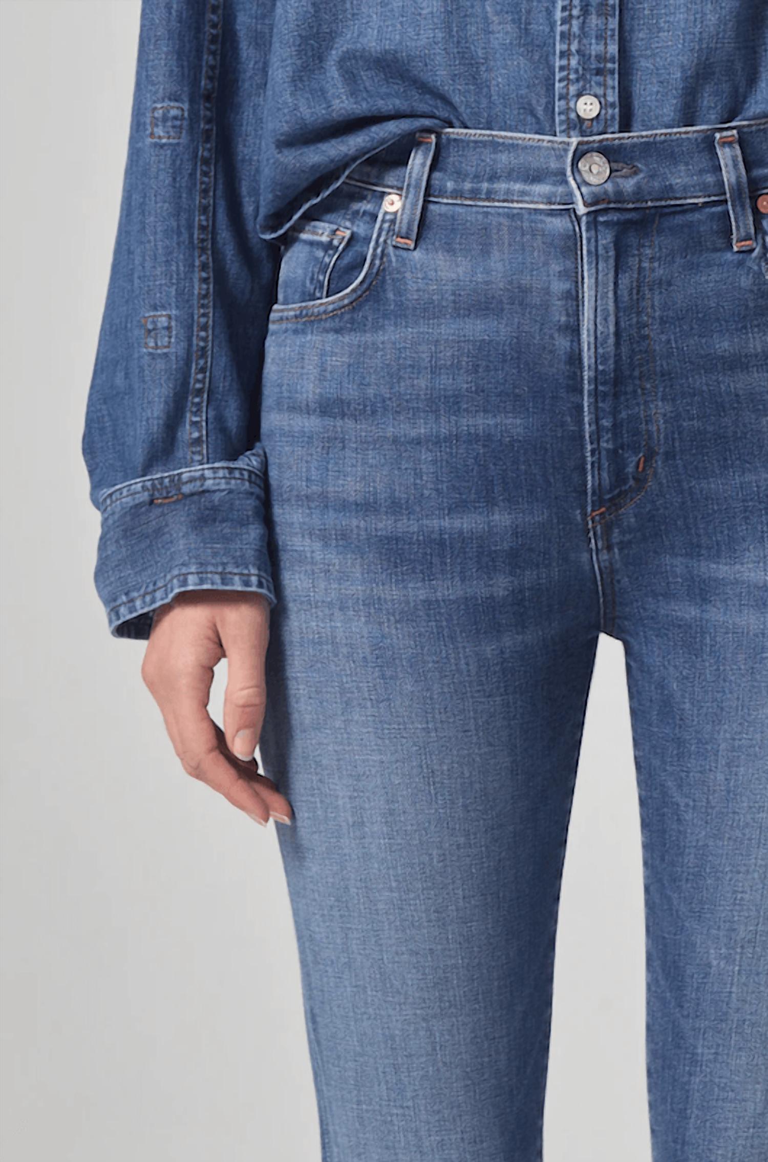 If you're looking for boot-cut, this is the jean for you. Introducing the Lilah Bootcut Jeans by Citizens of Humanity, a chic embodiment of 70's glamour with a modern twist. Crafted from a soft cotton blend, these jeans feature a high-rise fit with slim thighs that elegantly flare out to 30" bootcut legs, all in a striking Lawless medium indigo wash. They come with practical pockets and secure with a side zipper closure. Designed for all-day comfort, these jeans are machine washable and can be tumble dried, making them a perfect choice for spring outings and summer dinner parties.