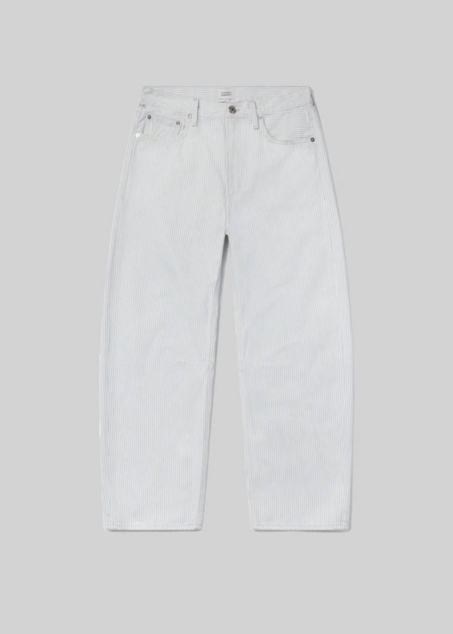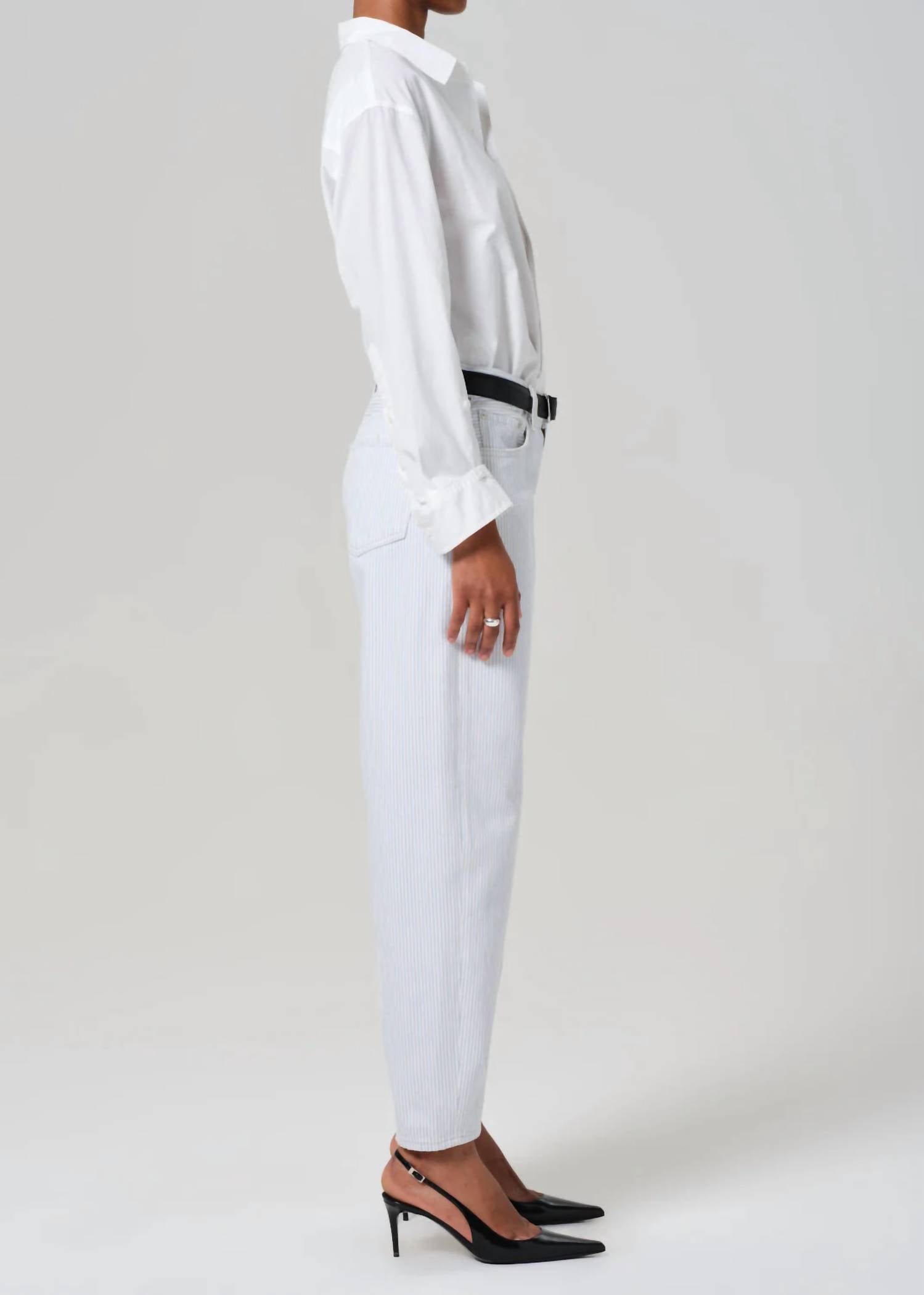 The Miro jean offers a slightly relaxed top block and tapered take on the barrel leg silhouette. This fit is true to size. Looks Like: Light pale blue and white striped denim. Feels Like: Rigid, non-stretch denim with an authentic feel. Closure: Zip Fly. Rise: 12". Inseam: 27 1/2". Leg Opening: 17 1/2". Model is 5'10" and wearing a size 27. Fabric: 100% Cotton. Care Instructions: Machine wash cold inside out with like colors. Do not bleach. Tumble dry low. Made in USA with imported materials.